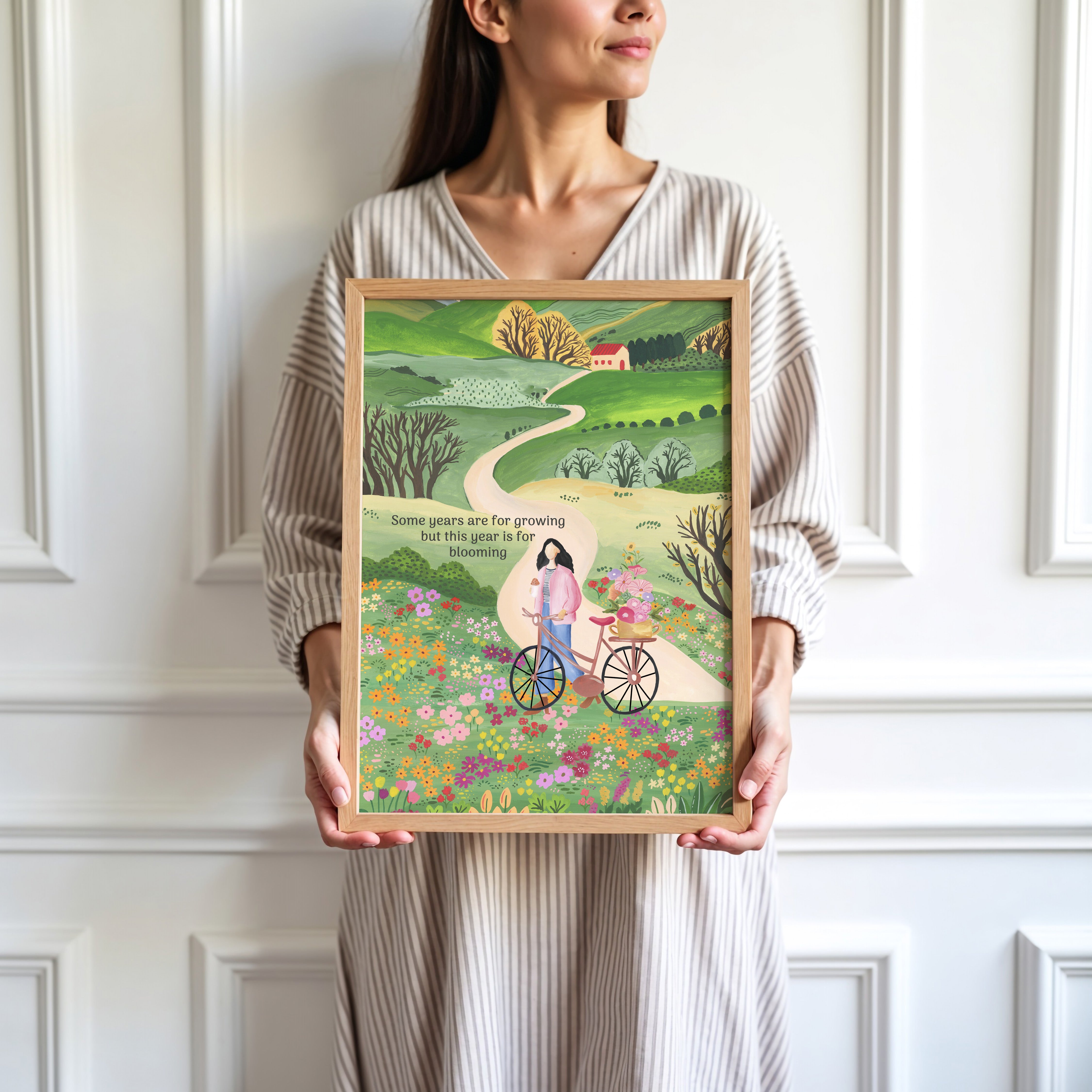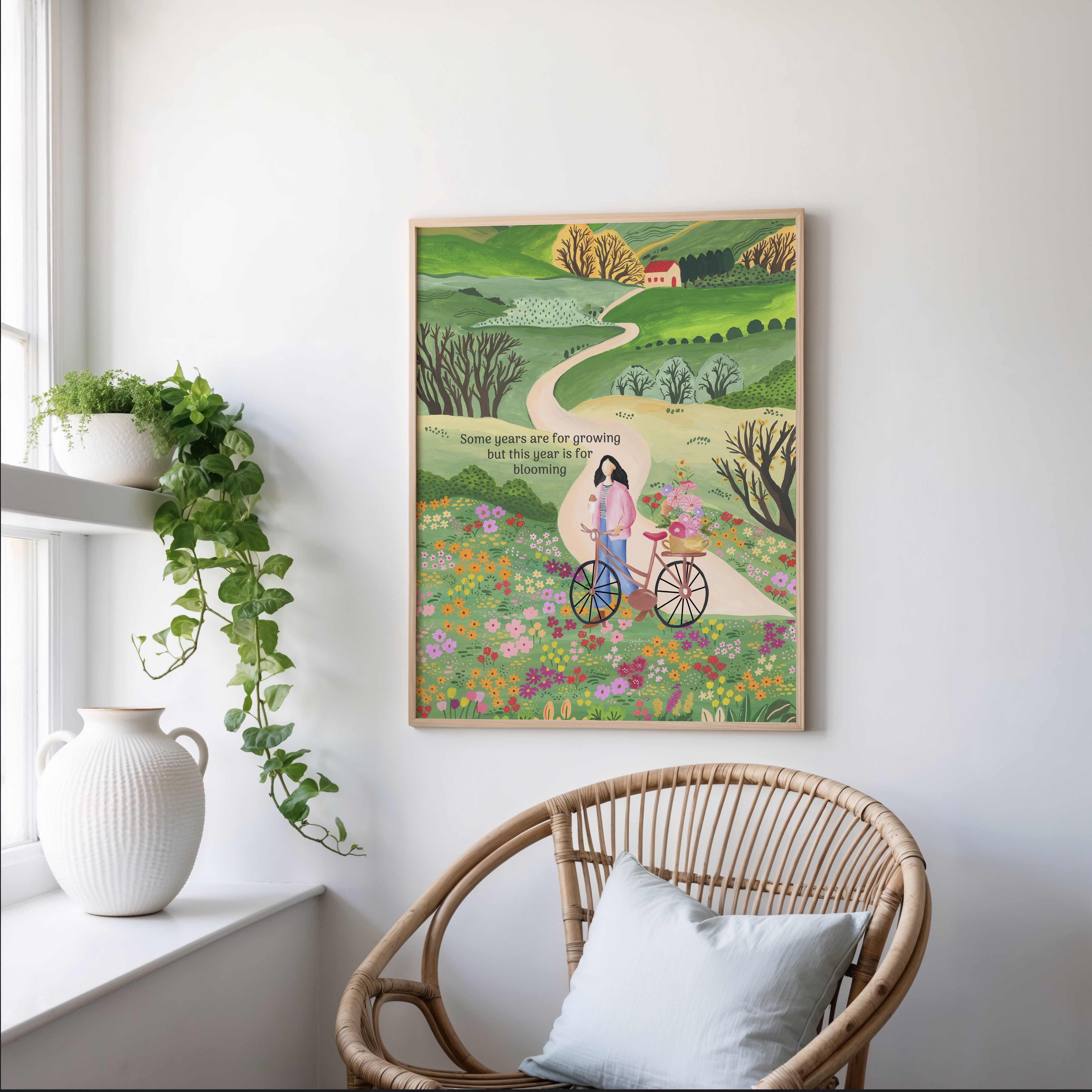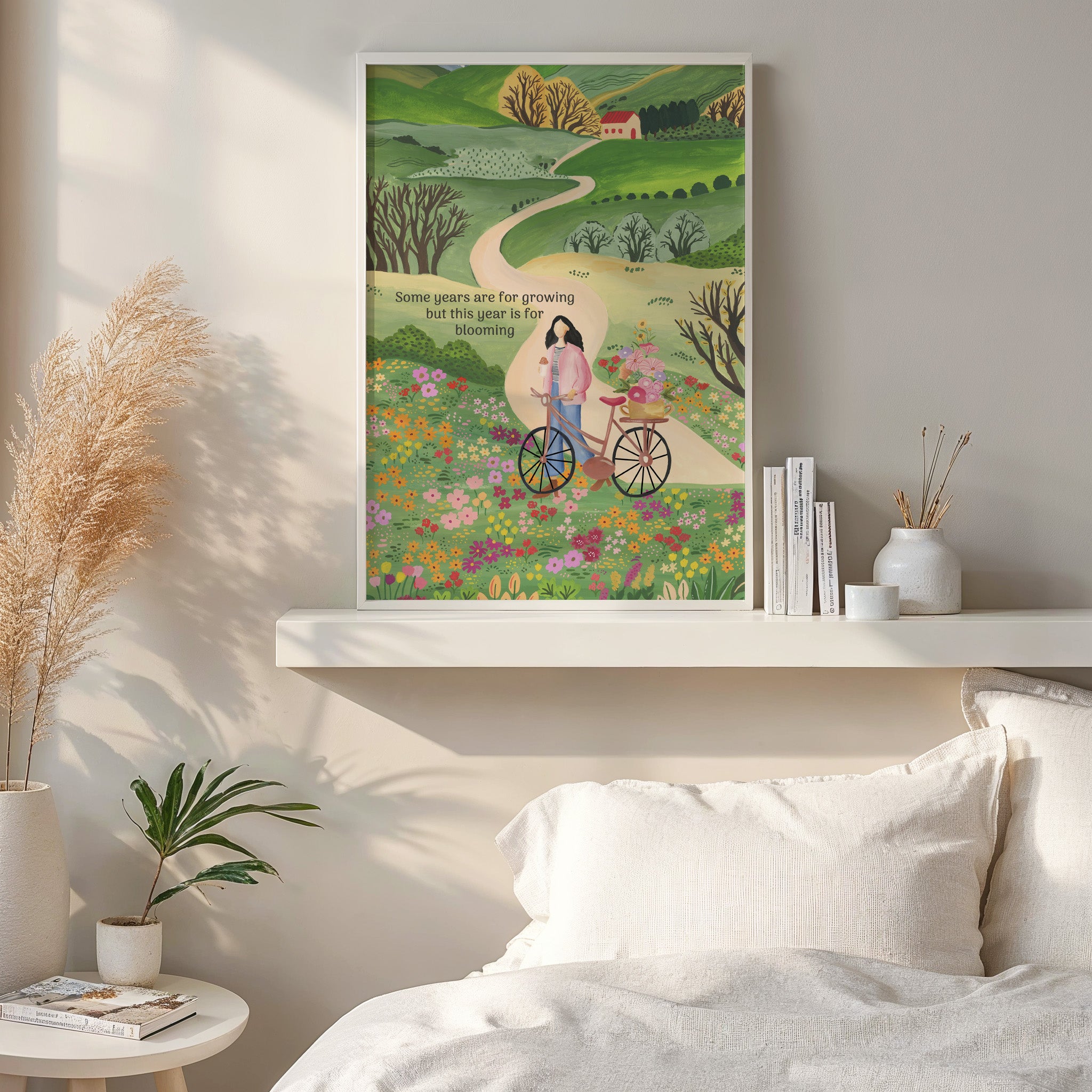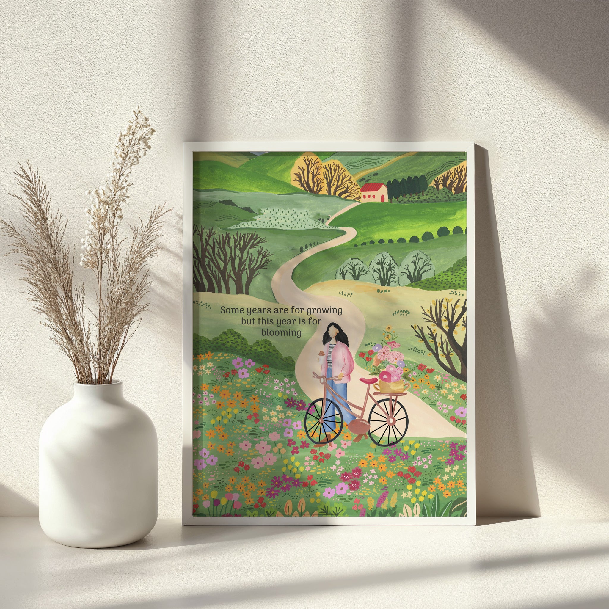 The artwork portrays a serene scene where a woman, seated comfortably amidst lush greenery and vibrant blossoms, takes a moment to unwind. The soothing palette of greens, pinks, and blues evokes a sense of calm, reinforcing the importance of self-care and inner peace. The words "Some year are for growing but this year is for blooming Wall Art" serve as a powerful affirmation, encouraging you to nurture your mind, body, and soul.