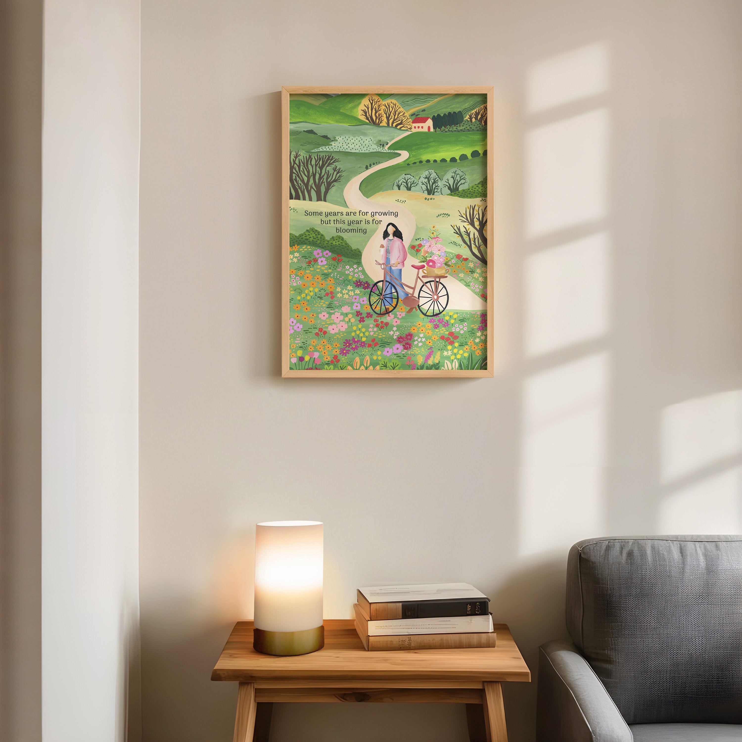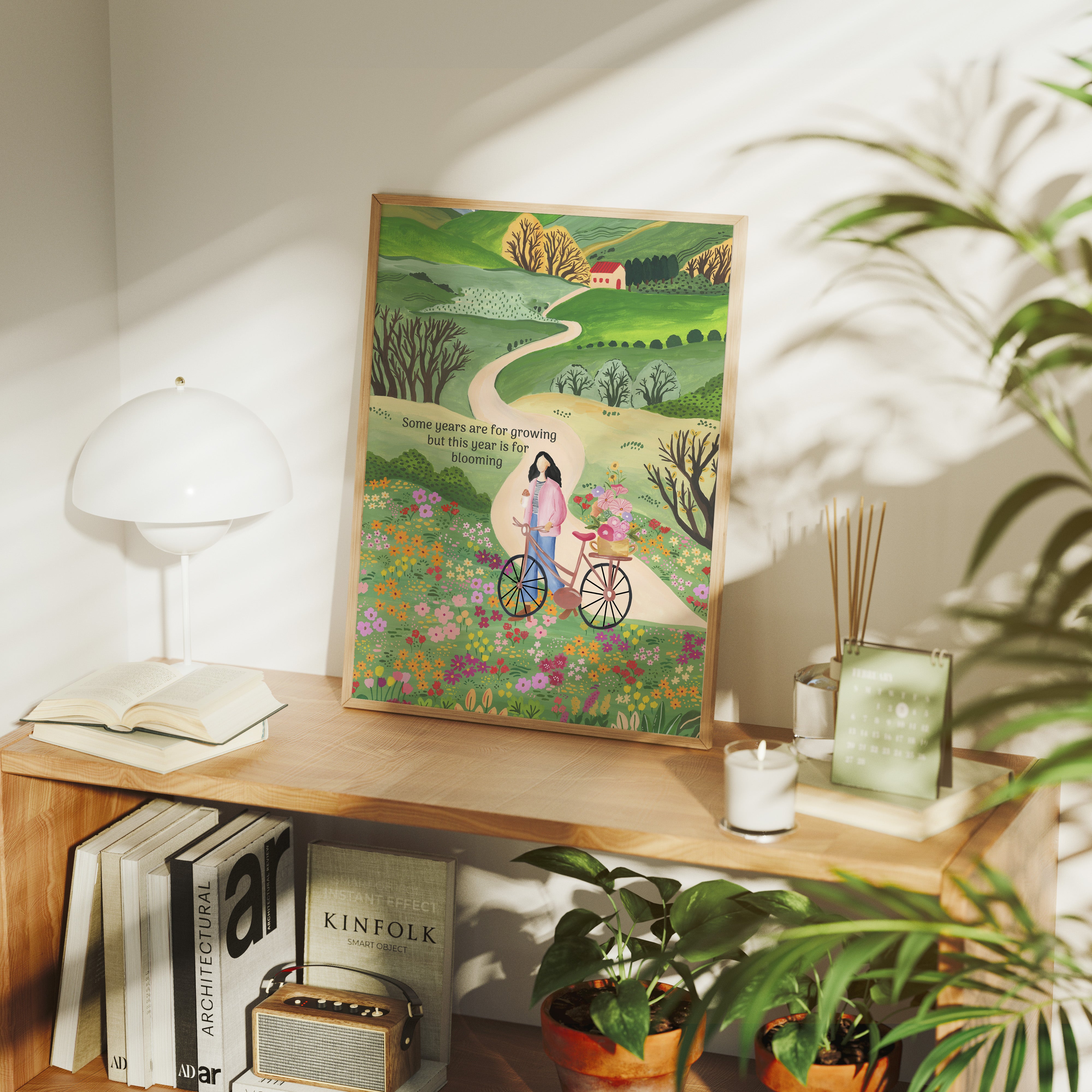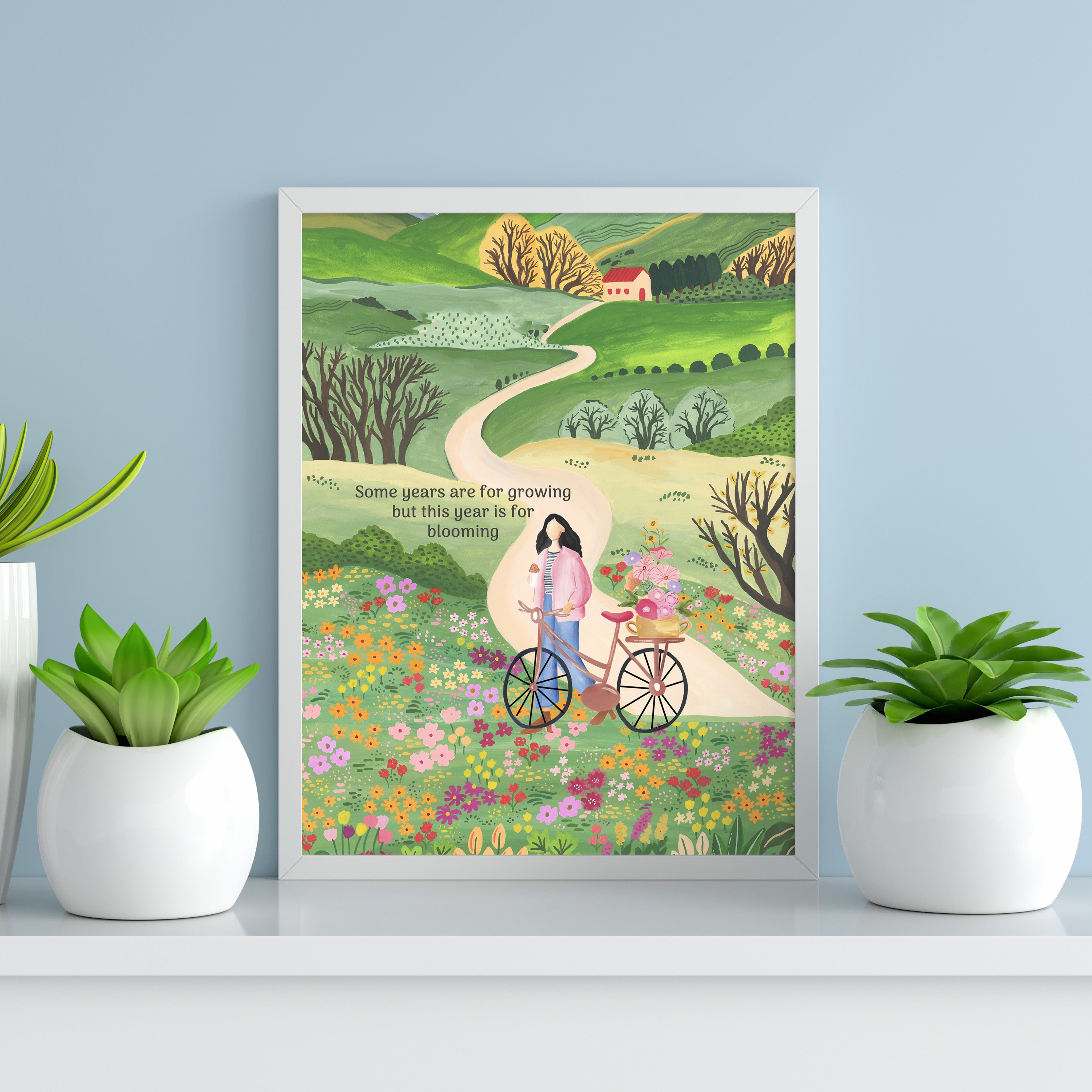 The artwork portrays a serene scene where a woman, seated comfortably amidst lush greenery and vibrant blossoms, takes a moment to unwind. The soothing palette of greens, pinks, and blues evokes a sense of calm, reinforcing the importance of self-care and inner peace. The words "Some year are for growing but this year is for blooming Wall Art" serve as a powerful affirmation, encouraging you to nurture your mind, body, and soul.