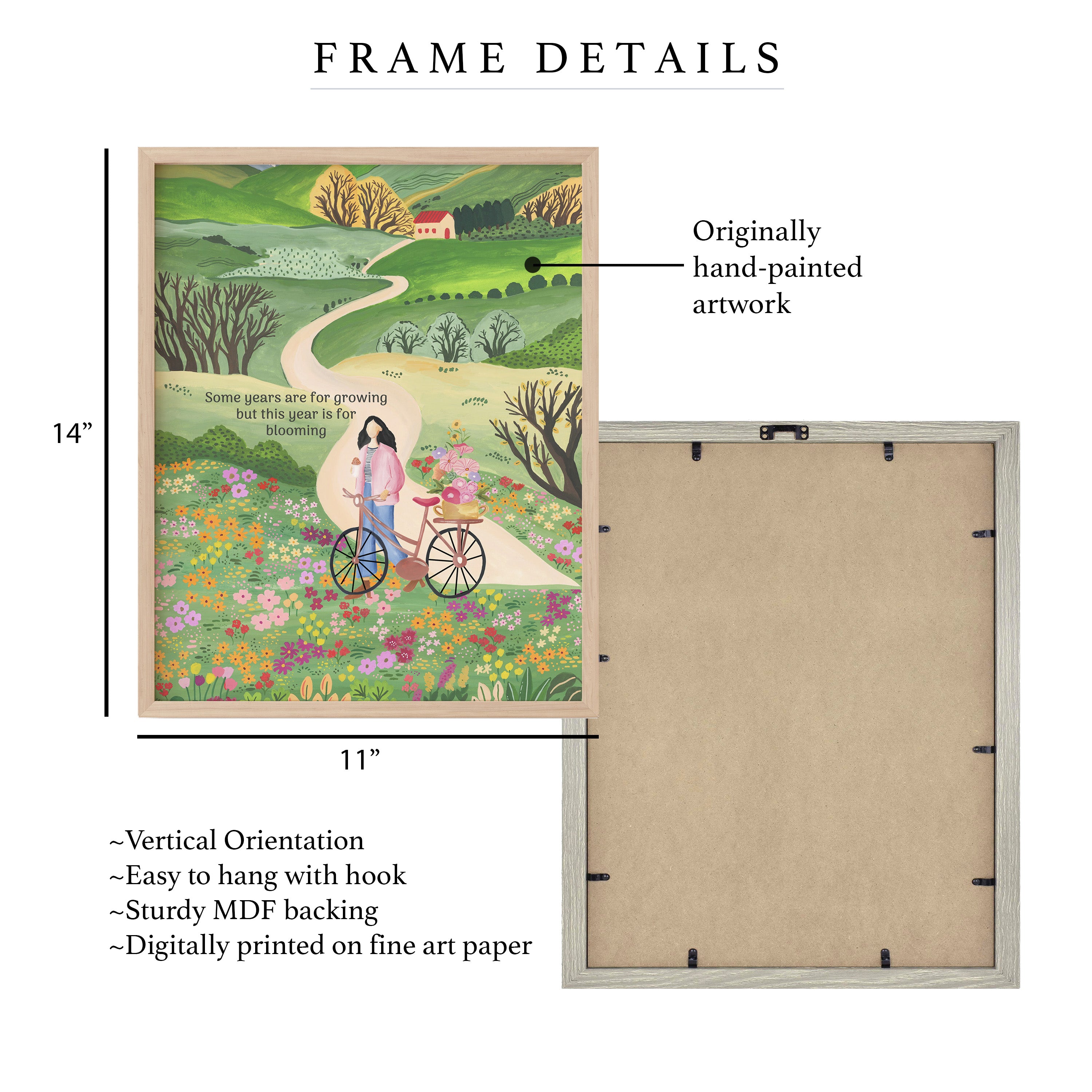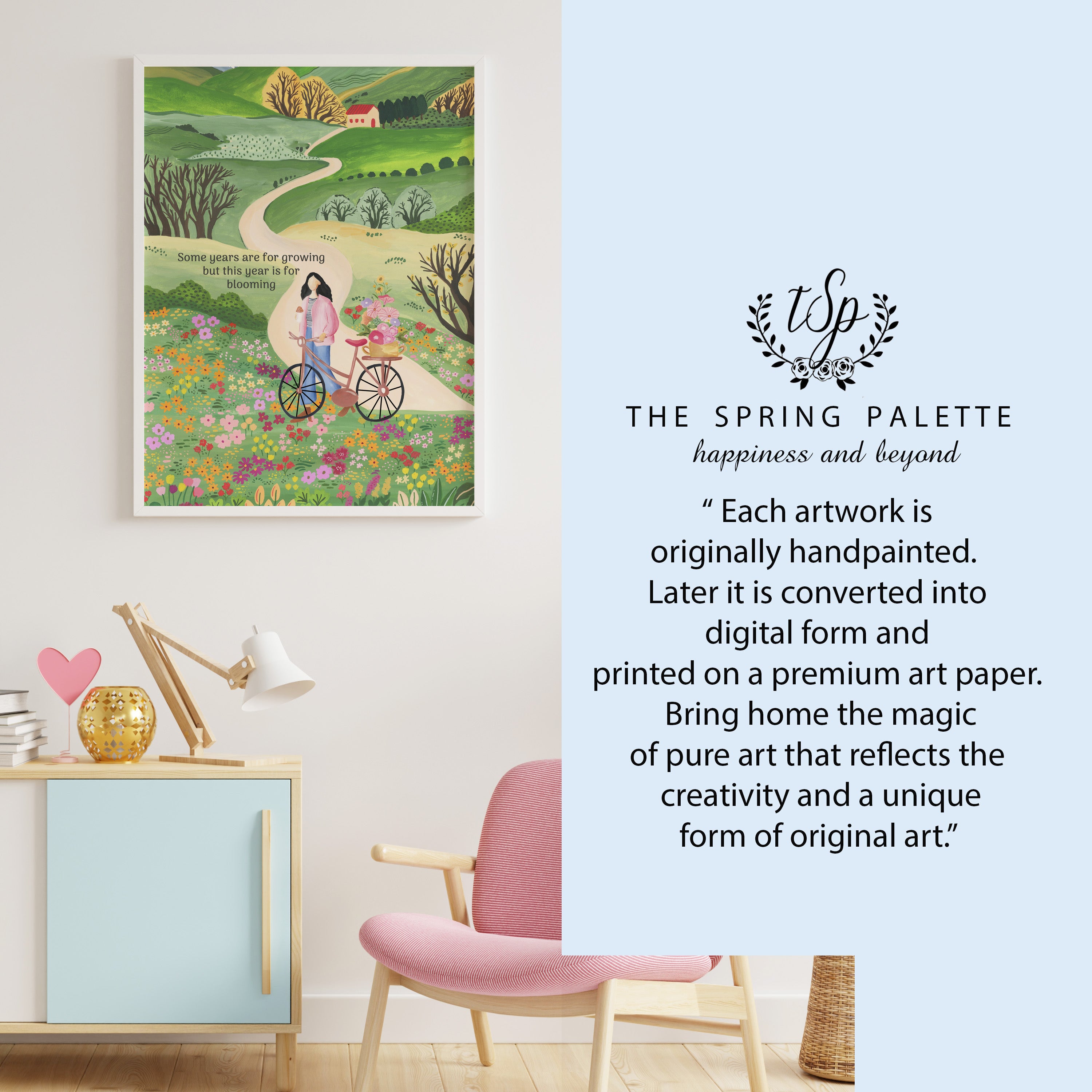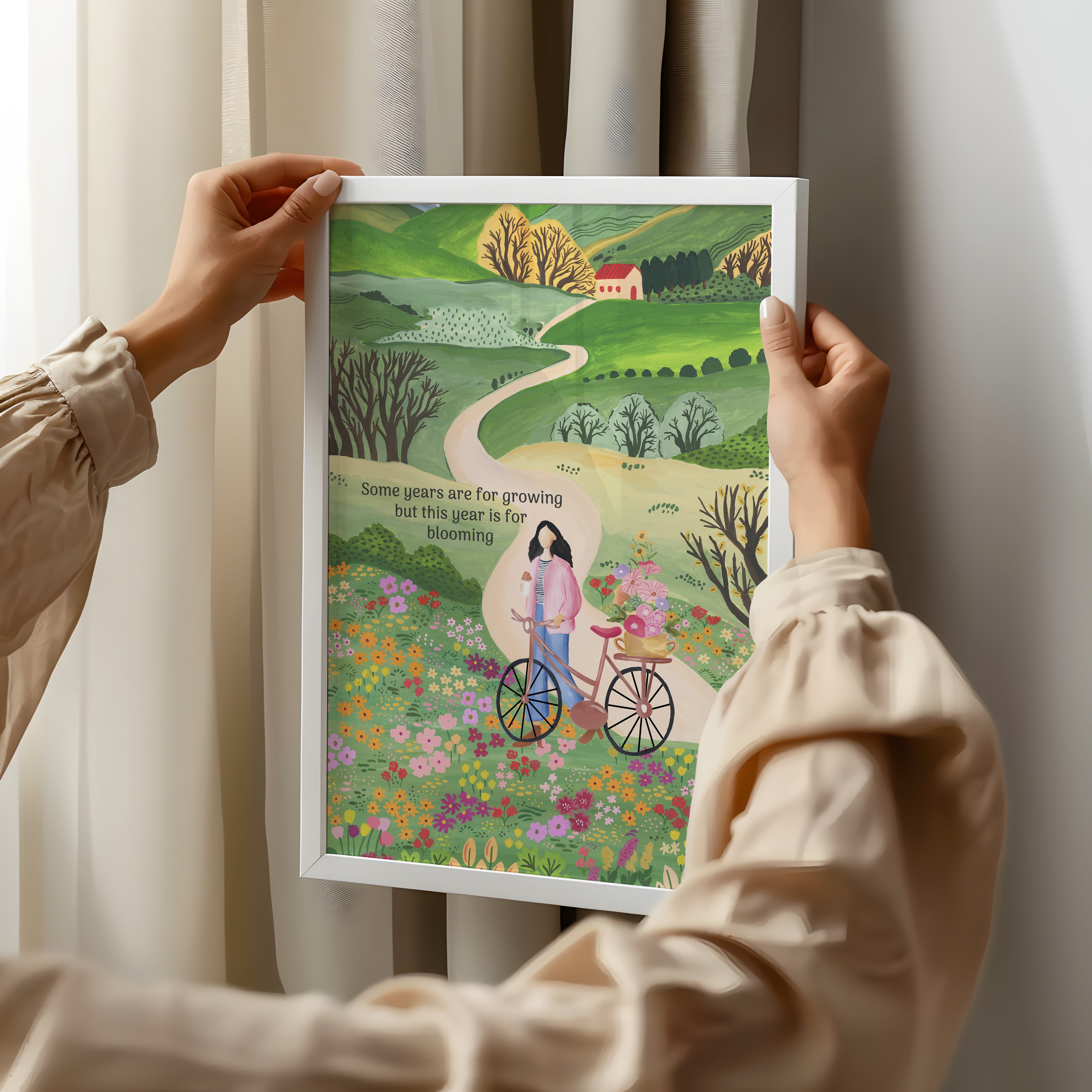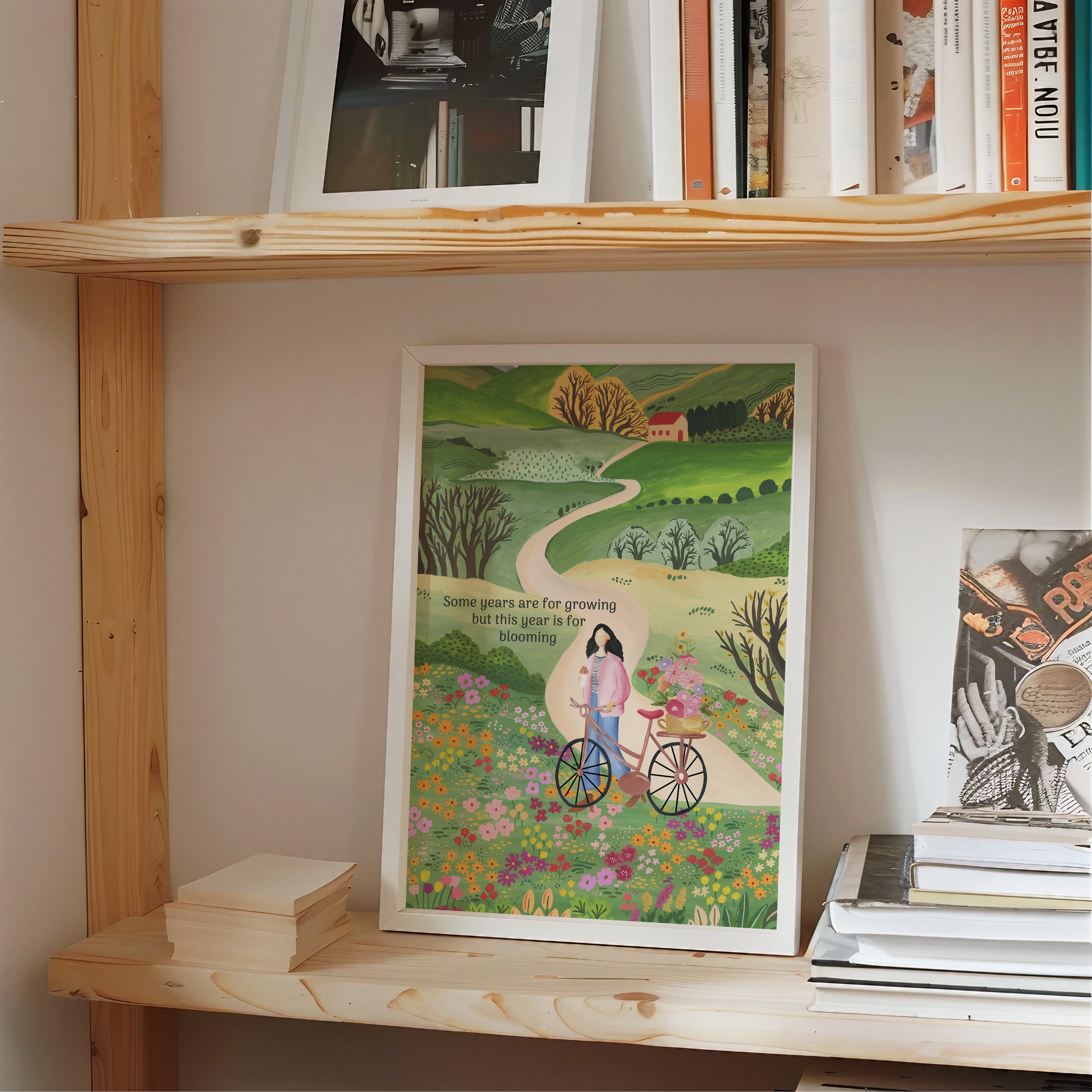 The artwork portrays a serene scene where a woman, seated comfortably amidst lush greenery and vibrant blossoms, takes a moment to unwind. The soothing palette of greens, pinks, and blues evokes a sense of calm, reinforcing the importance of self-care and inner peace. The words "Some year are for growing but this year is for blooming Wall Art" serve as a powerful affirmation, encouraging you to nurture your mind, body, and soul.