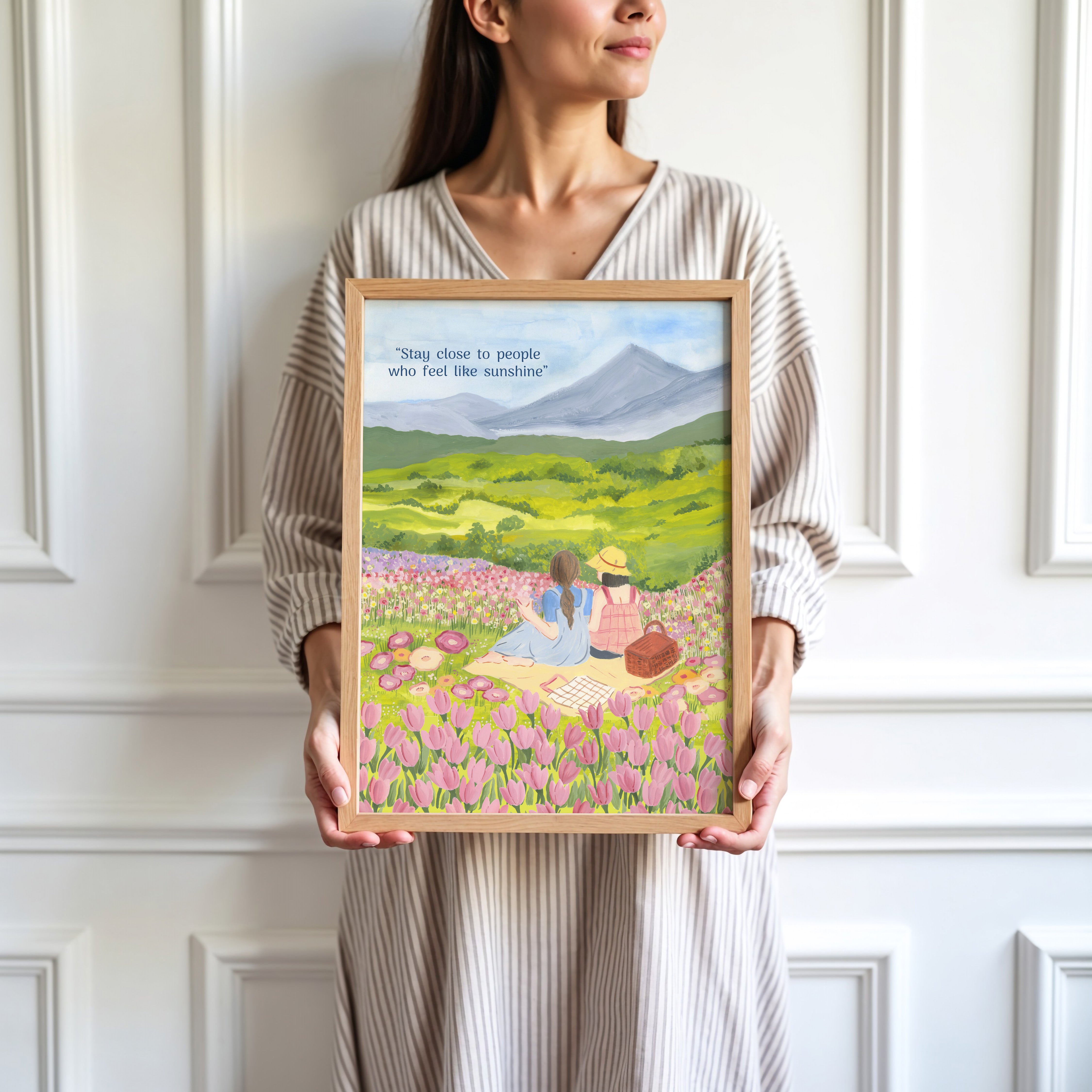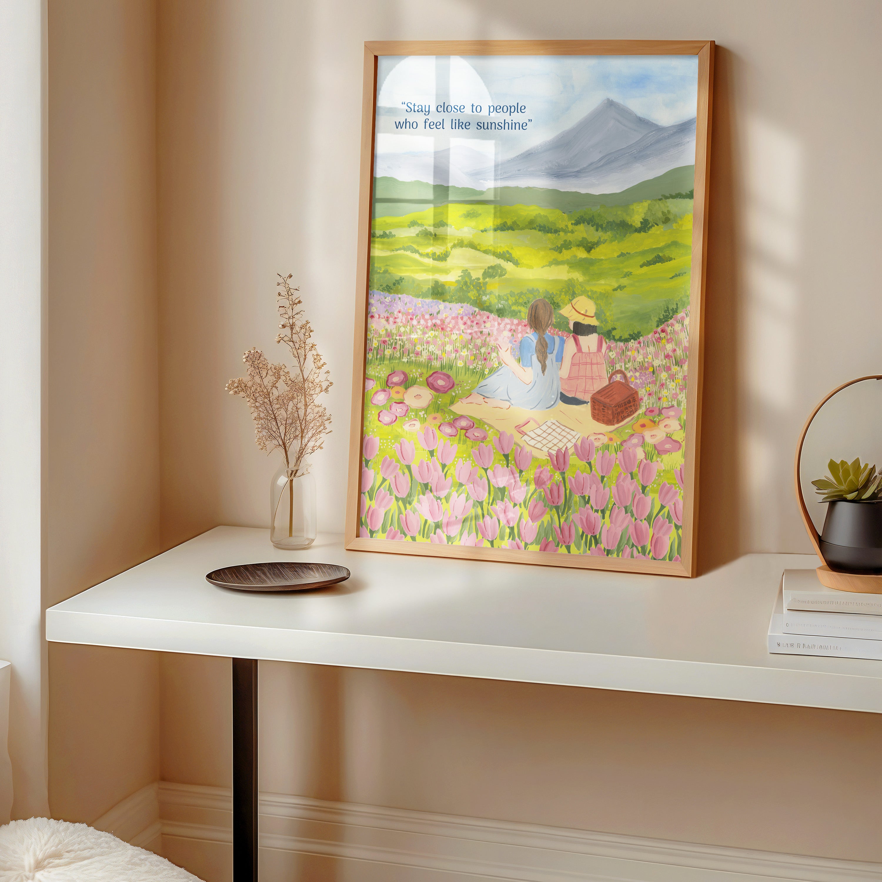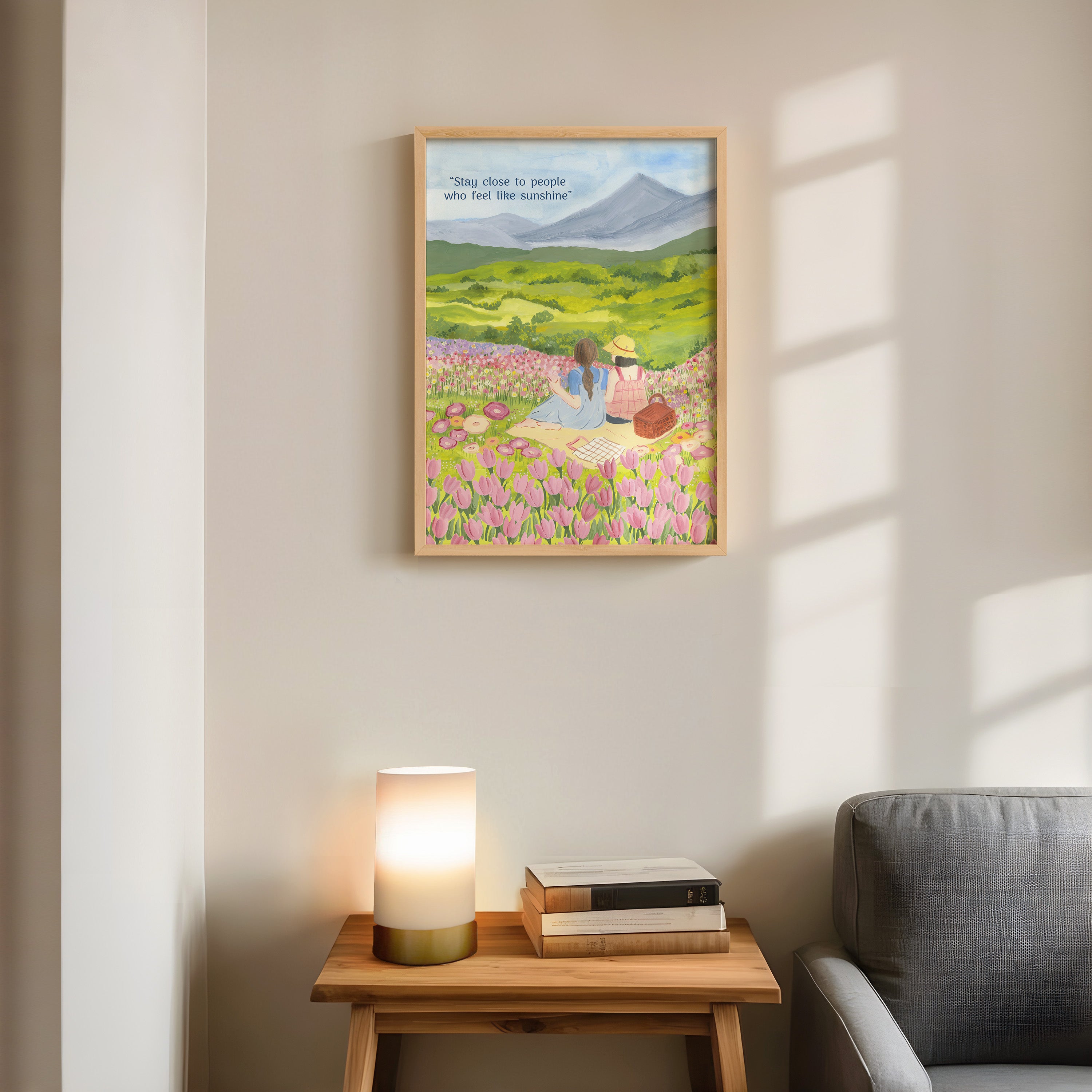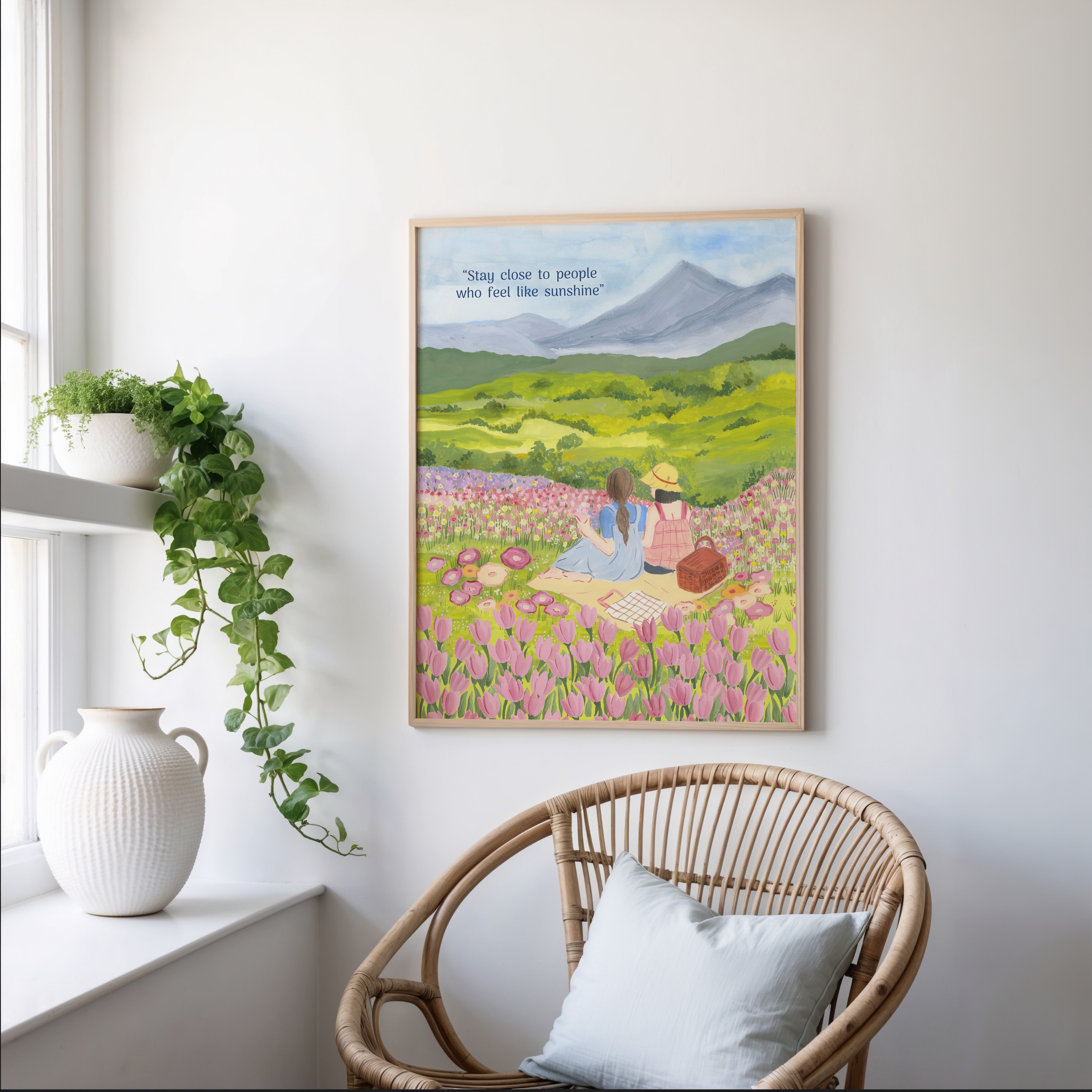 The artwork portrays a serene scene where a woman, seated comfortably amidst lush greenery and vibrant blossoms, takes a moment to unwind. The soothing palette of greens, pinks, and blues evokes a sense of calm, reinforcing the importance of self-care and inner peace. The words "Stay close to people who feel like sunshine Wall Art" serve as a powerful affirmation, encouraging you to nurture your mind, body, and soul.