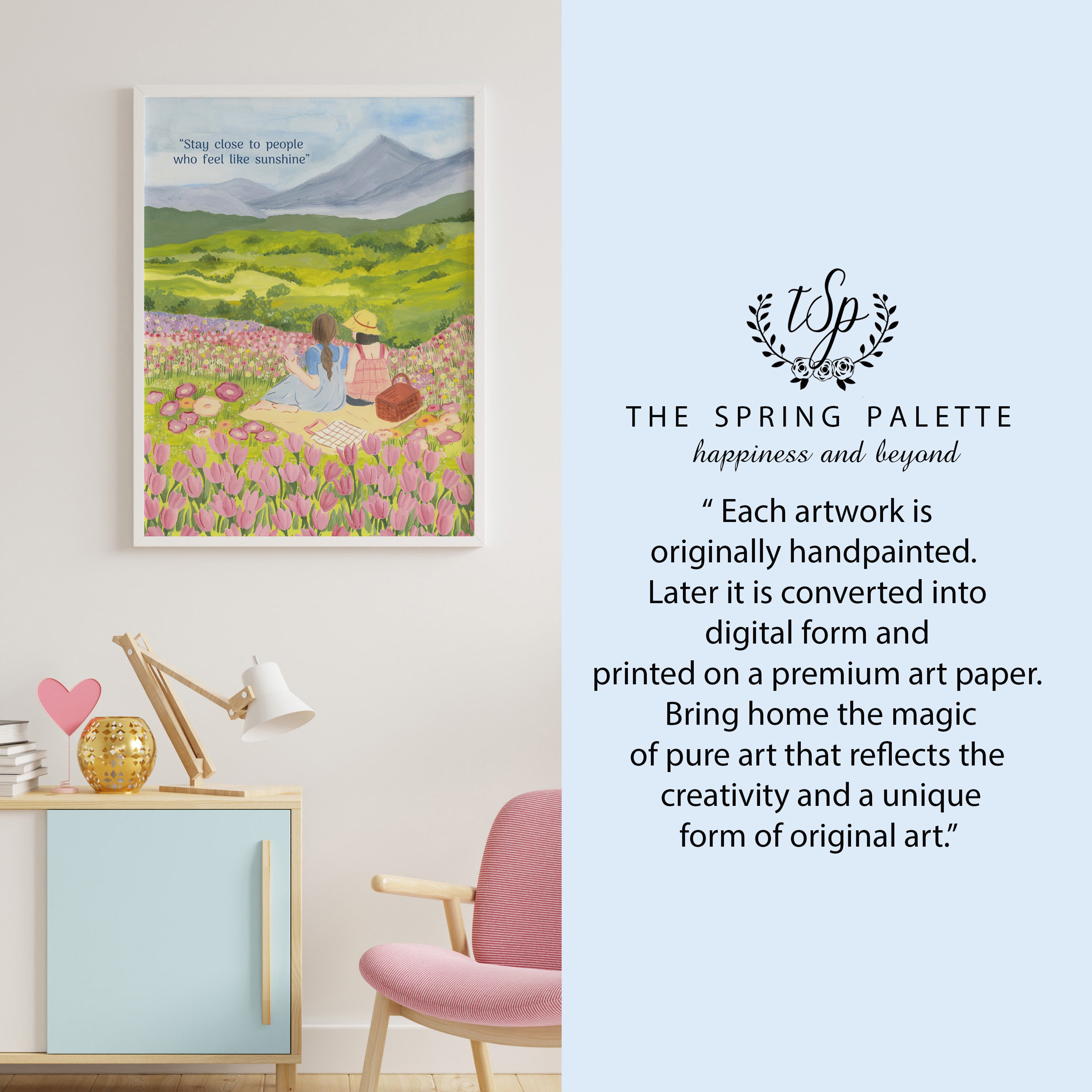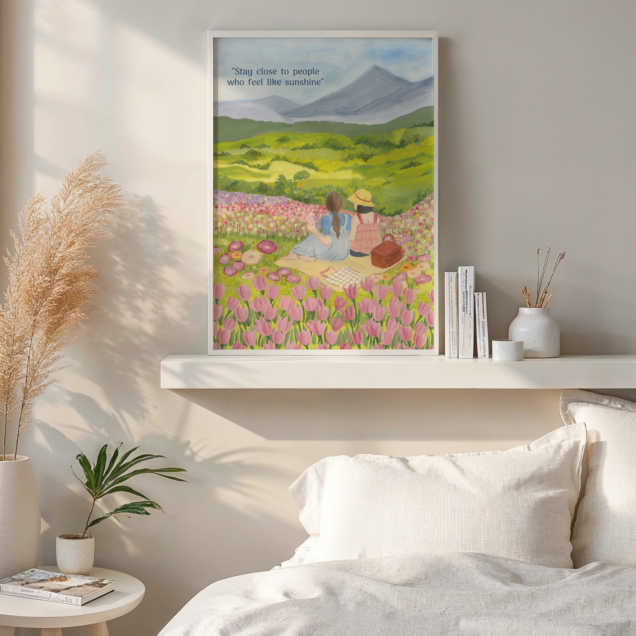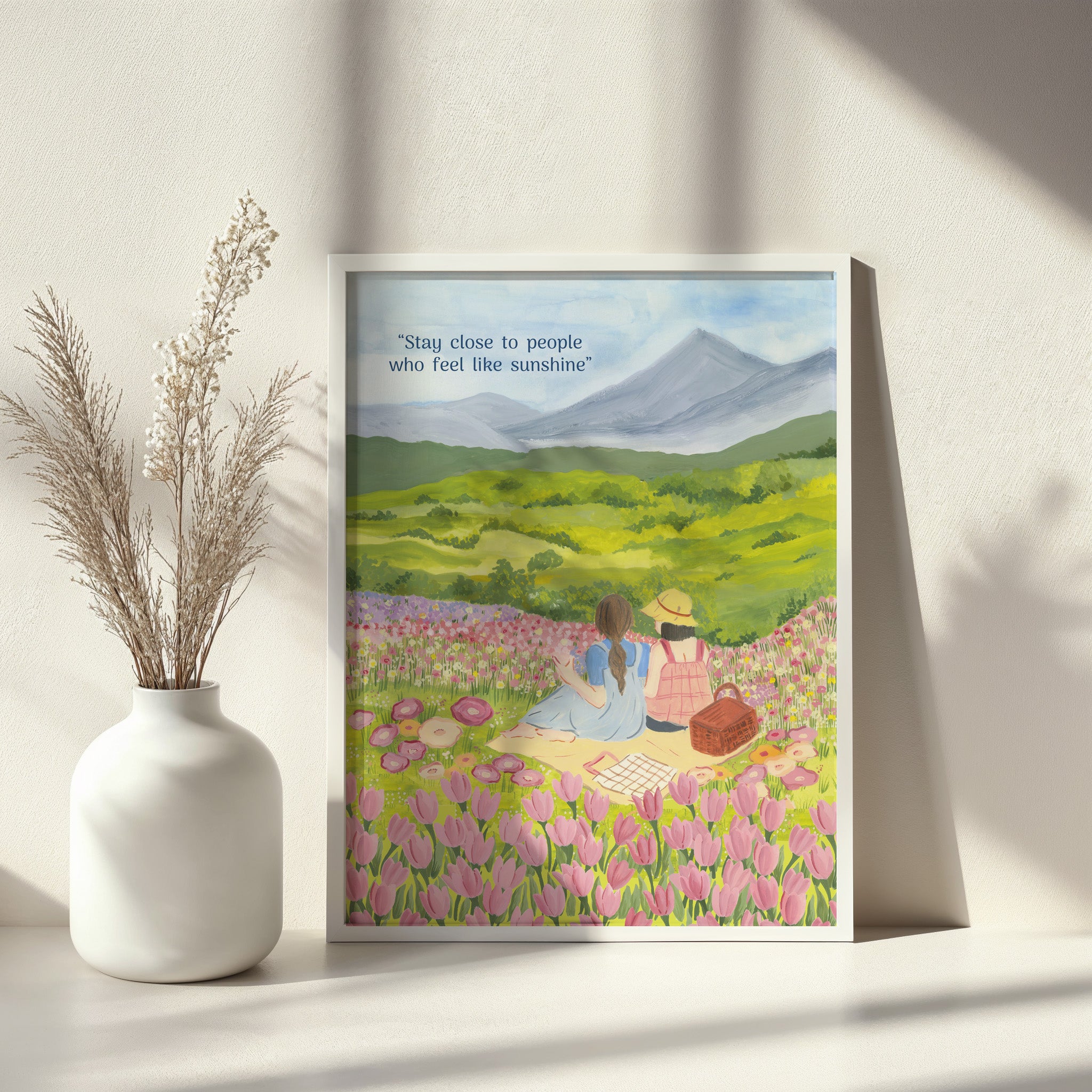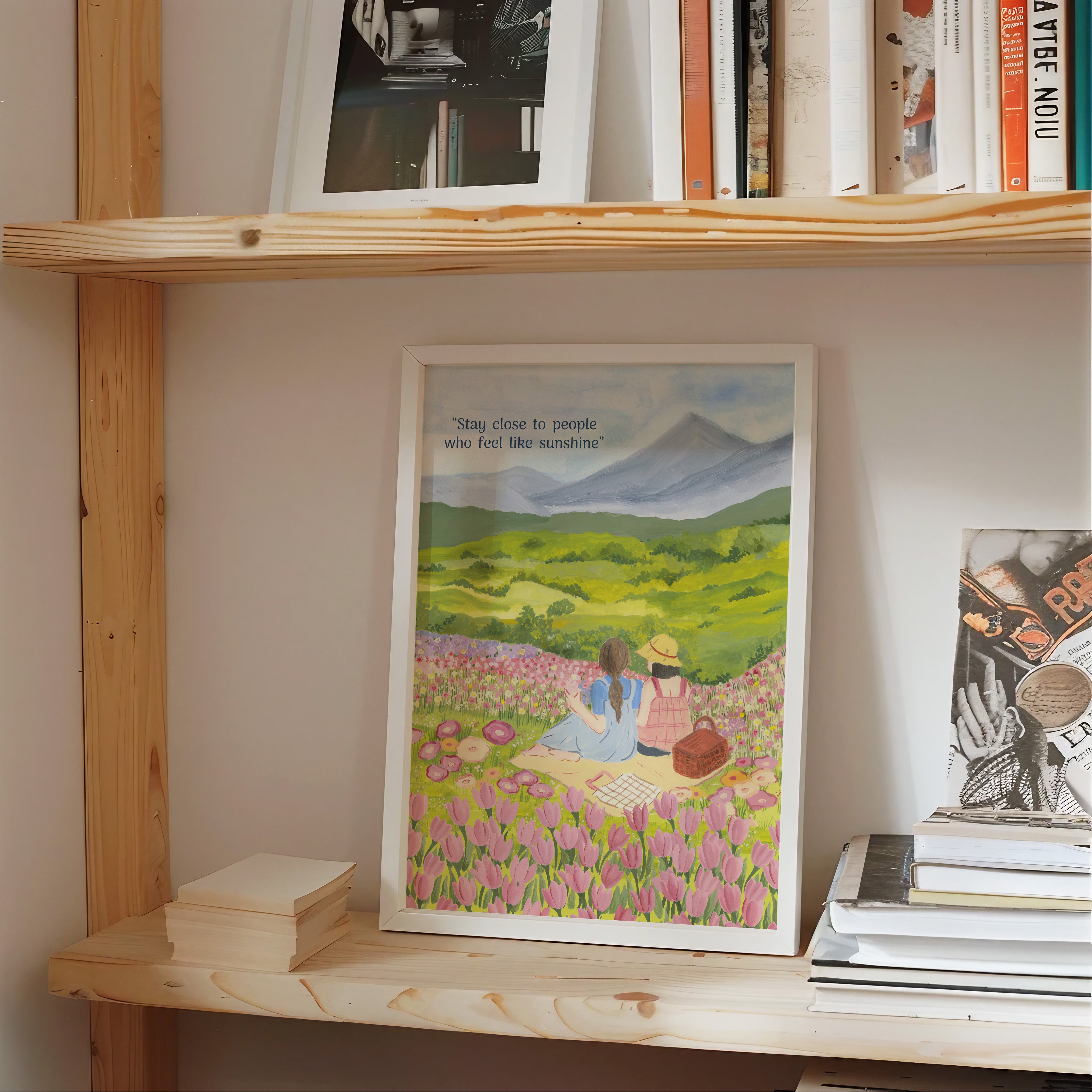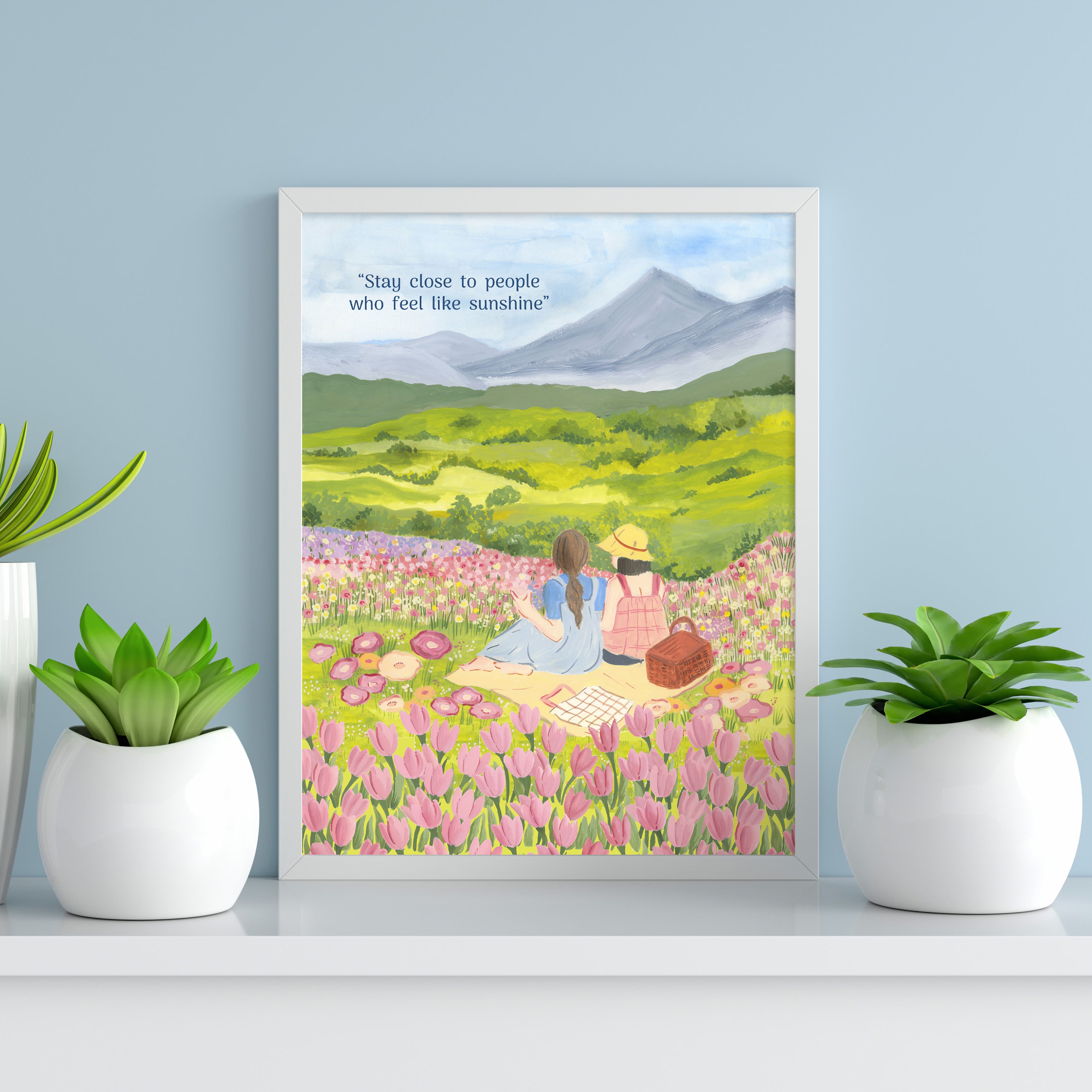 The artwork portrays a serene scene where a woman, seated comfortably amidst lush greenery and vibrant blossoms, takes a moment to unwind. The soothing palette of greens, pinks, and blues evokes a sense of calm, reinforcing the importance of self-care and inner peace. The words "Stay close to people who feel like sunshine Wall Art" serve as a powerful affirmation, encouraging you to nurture your mind, body, and soul.