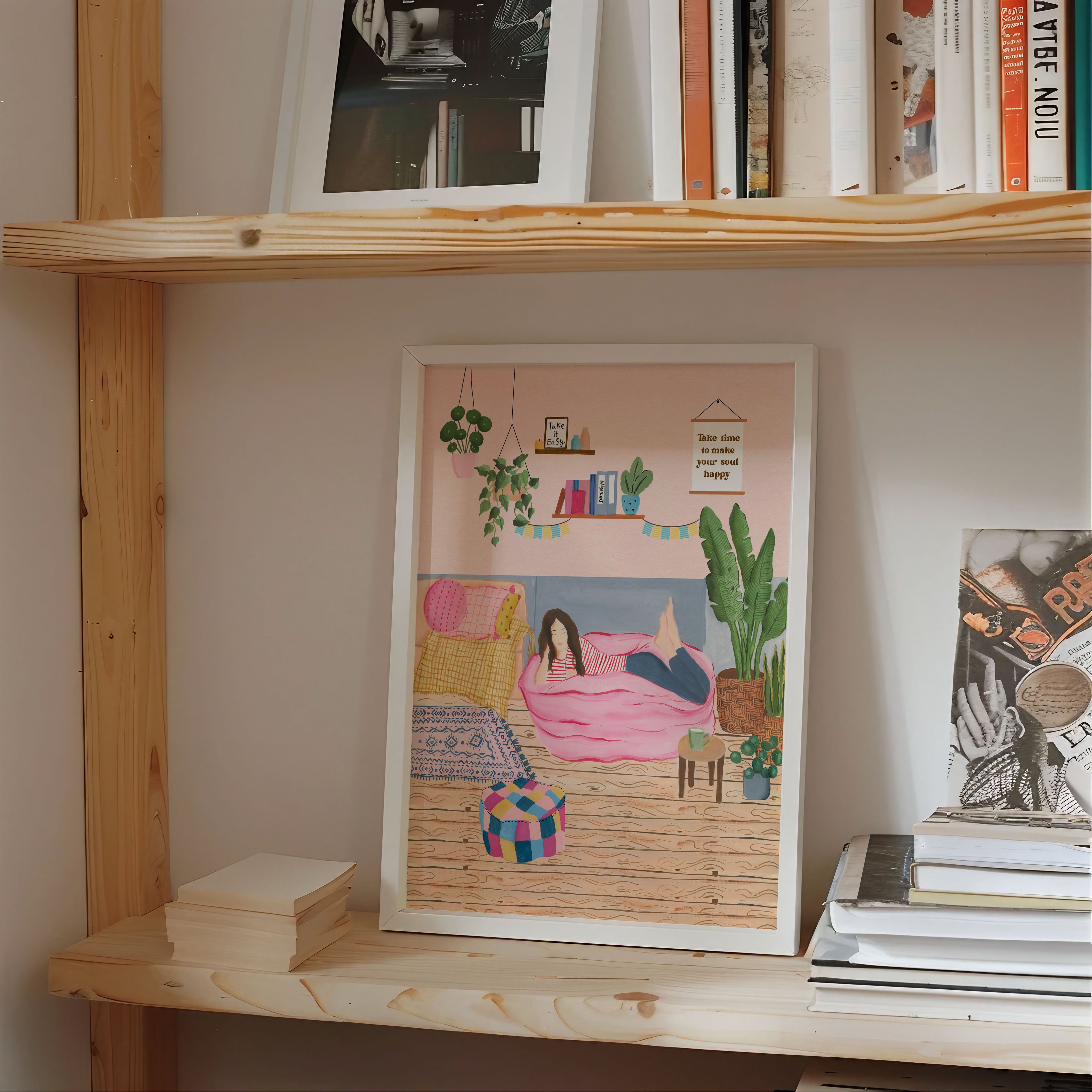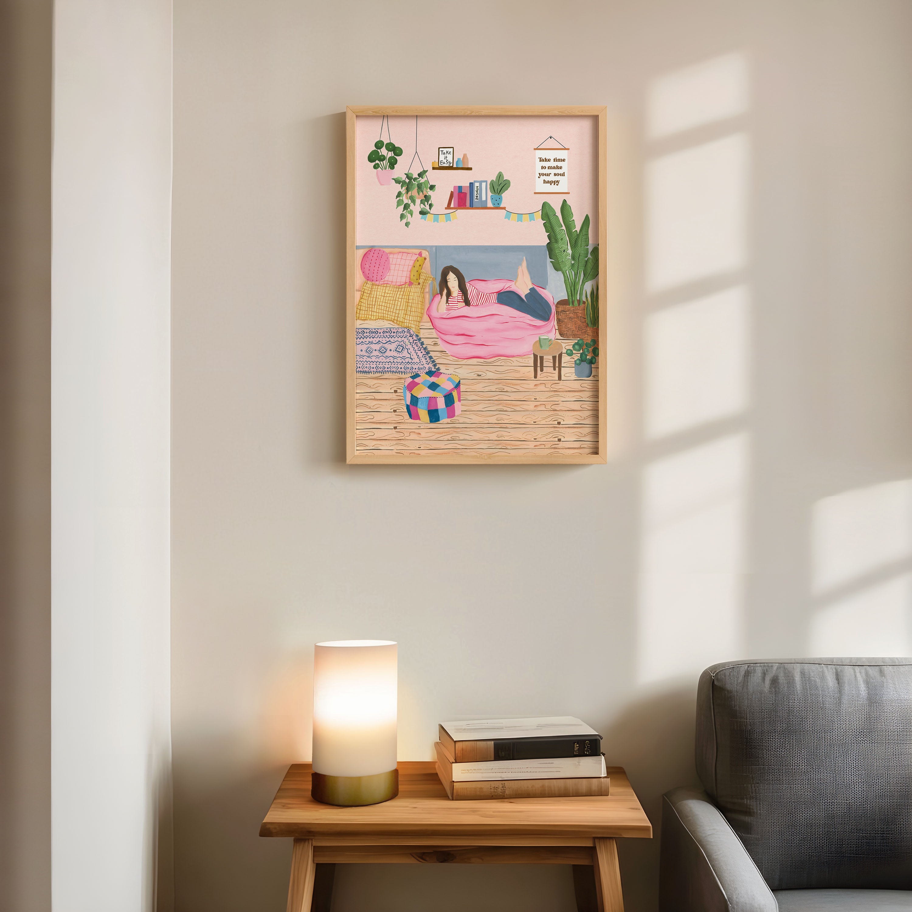 The artwork portrays a serene scene where a woman, seated comfortably amidst lush greenery and vibrant blossoms, takes a moment to unwind. The soothing palette of greens, pinks, and blues evokes a sense of calm, reinforcing the importance of self-care and inner peace. The words "Take Time To Make Your Soul Happy" serve as a powerful affirmation, encouraging you to nurture your mind, body, and soul.