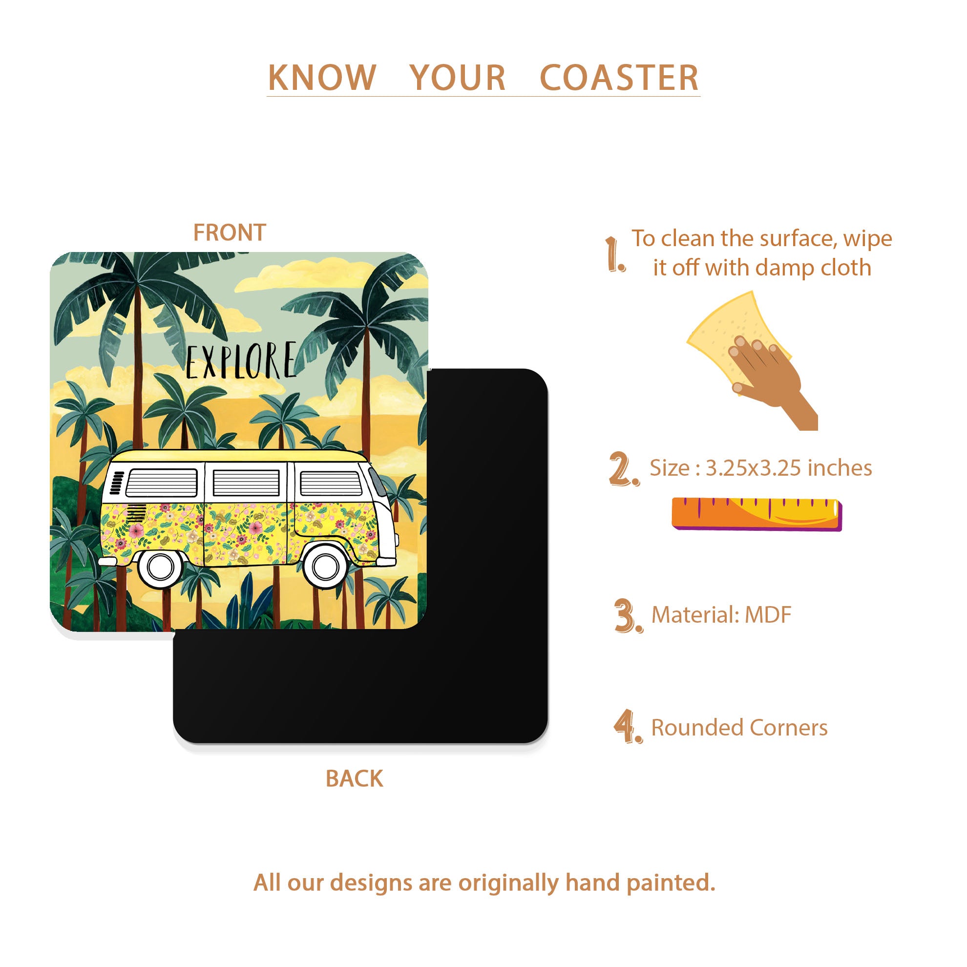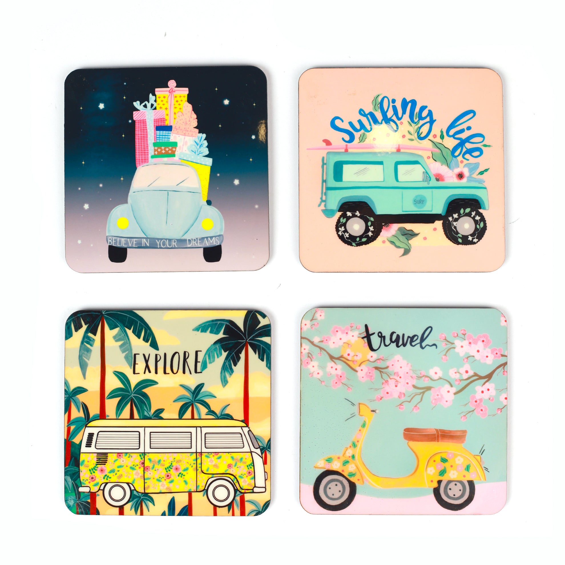 "Zoom into fun with our Wheels & Whimsy Coasters, where each coaster features quirky vehicle illustrations that'll drive your imagination wild!"Item Description