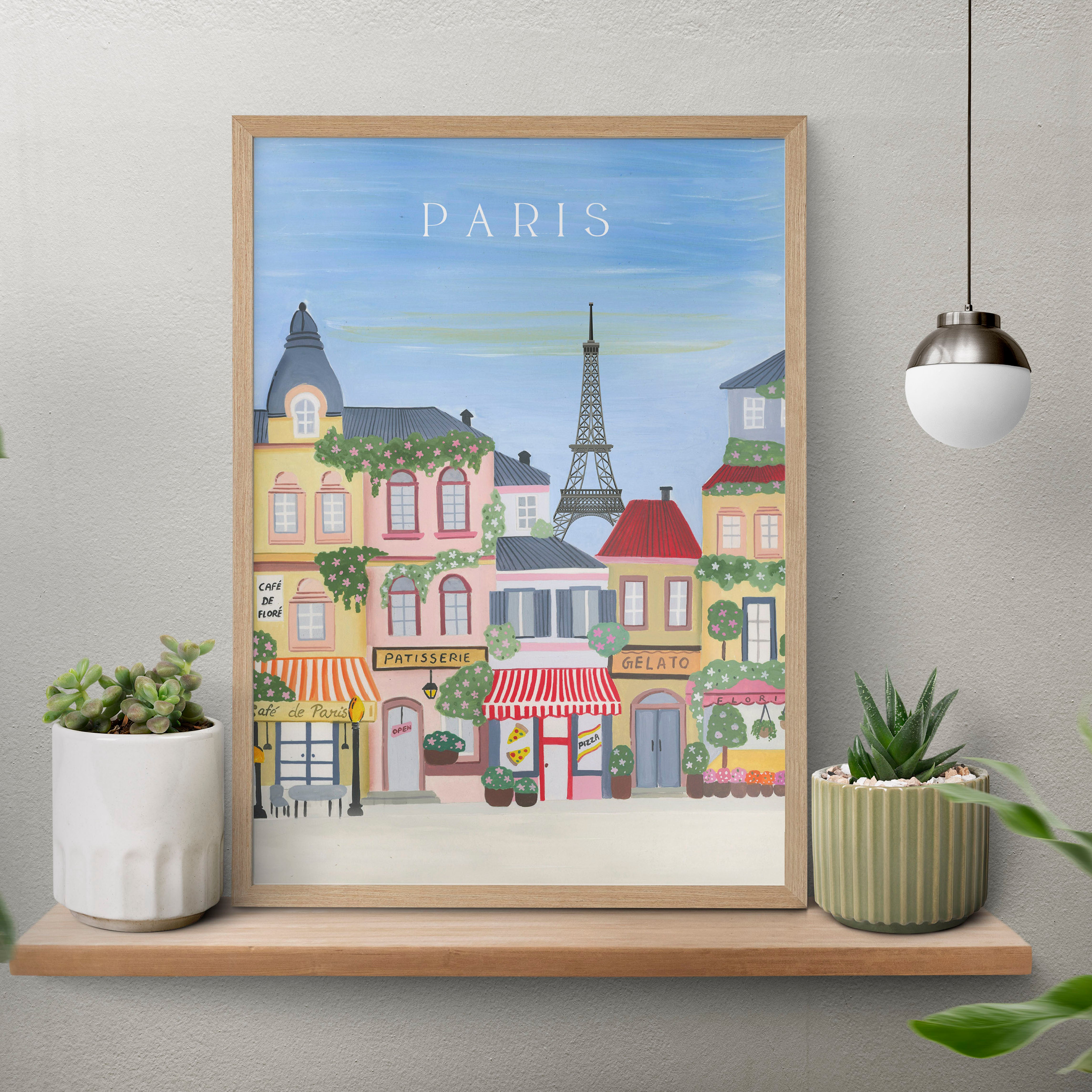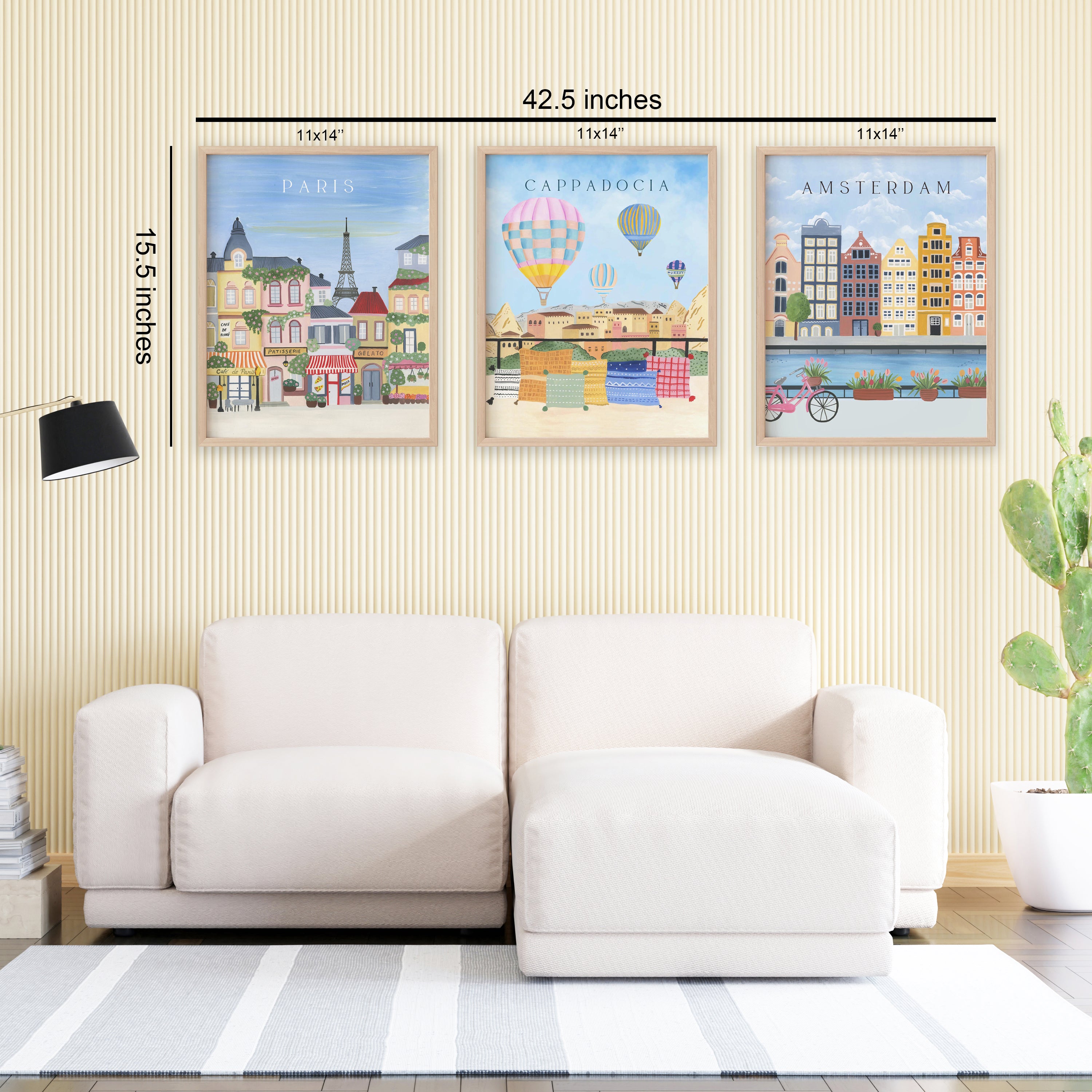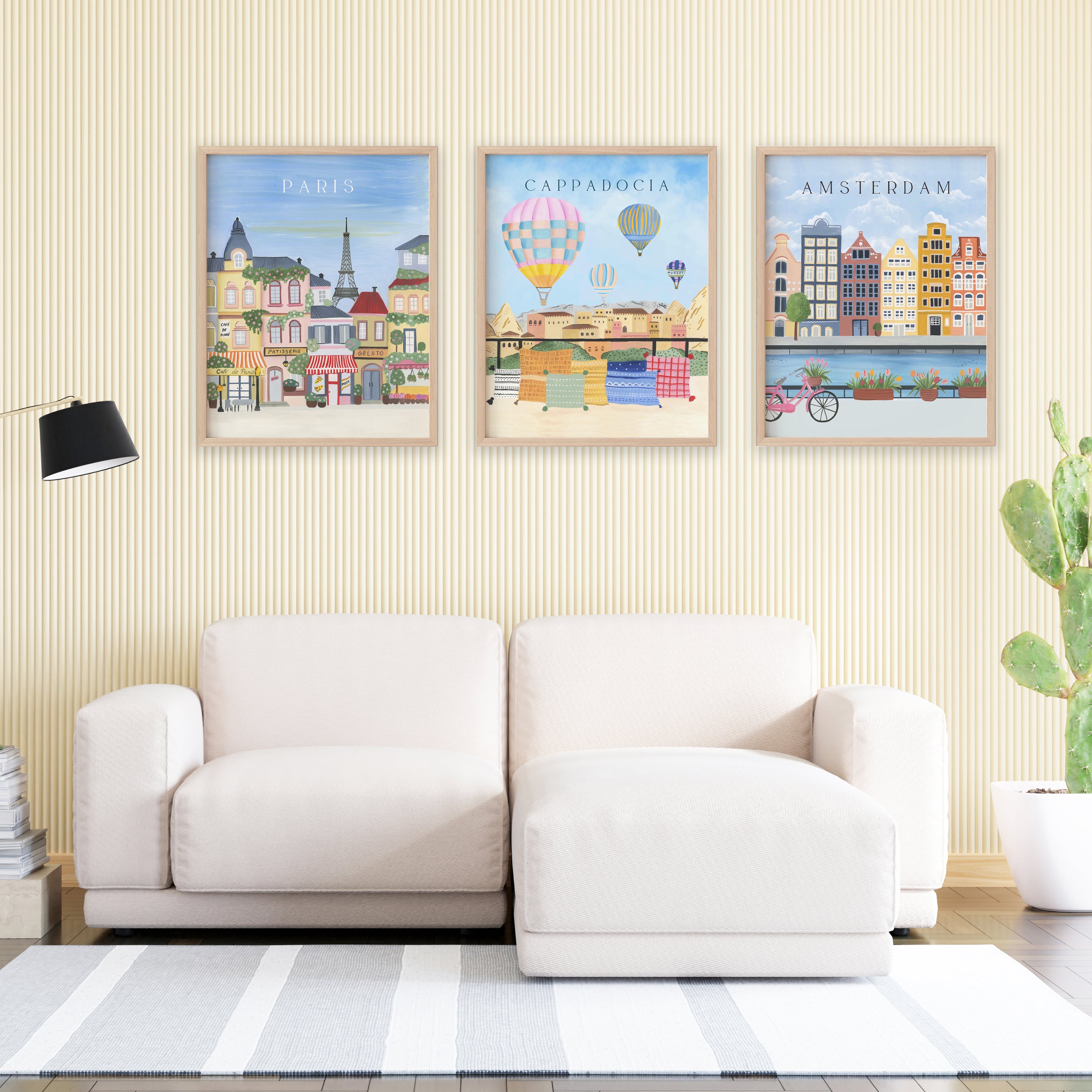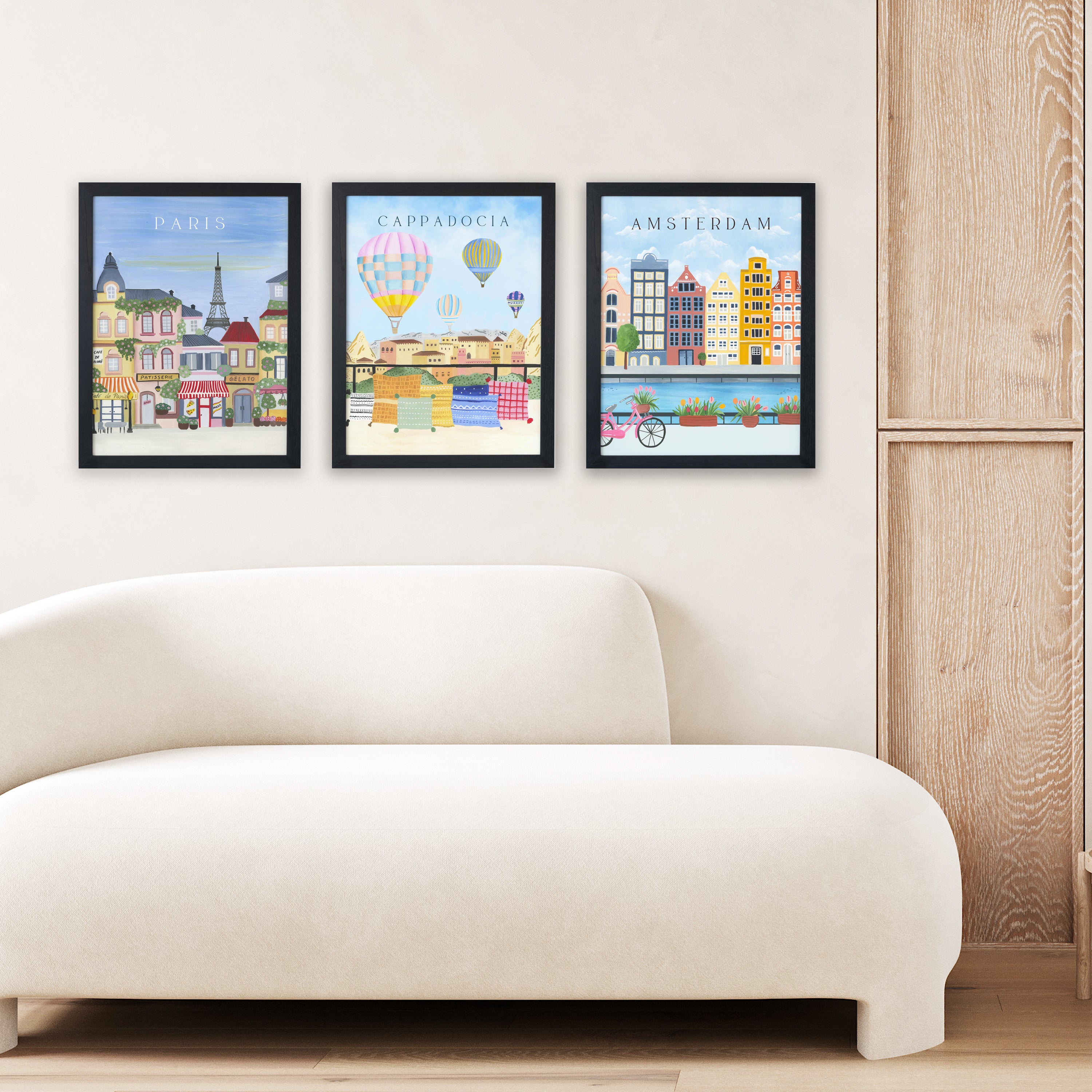 These vibrant travel-themed wall art frames capture the charm of Paris, the magic of Cappadocia, and the warmth of Amsterdam in a whimsical, handpainted style. With pastel tones, iconic landmarks, and playful details like hot air balloons and canal bikes, this trio brings wanderlust and color into any home. Perfect for living rooms, travel corners, or cozy reading nooks, these prints instantly brighten up your space and spark joy with every glance—a beautiful way to travel the world from the comfort of your home.Curated collection designed for your lovely walls based on original hand-painted illustrations of TSP: