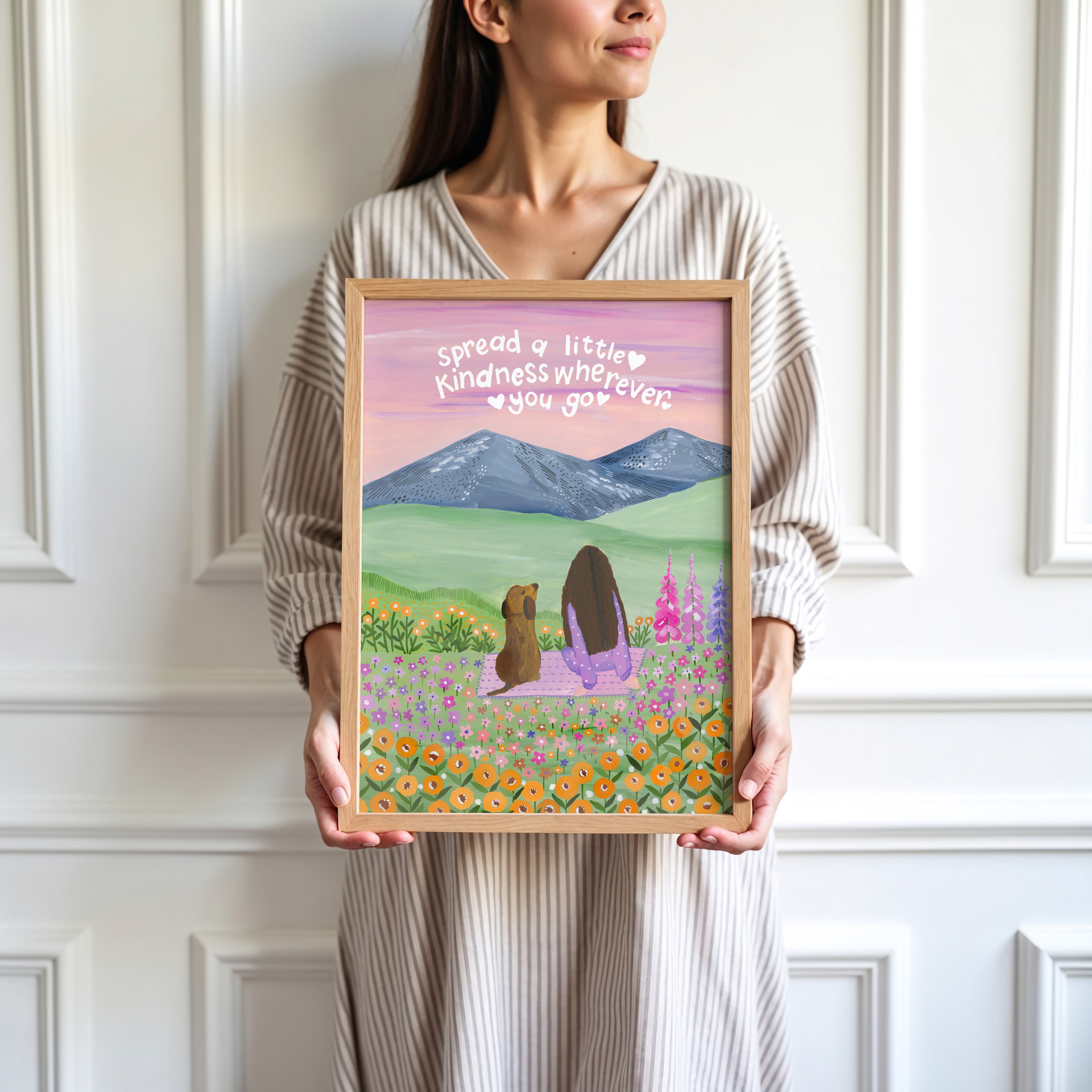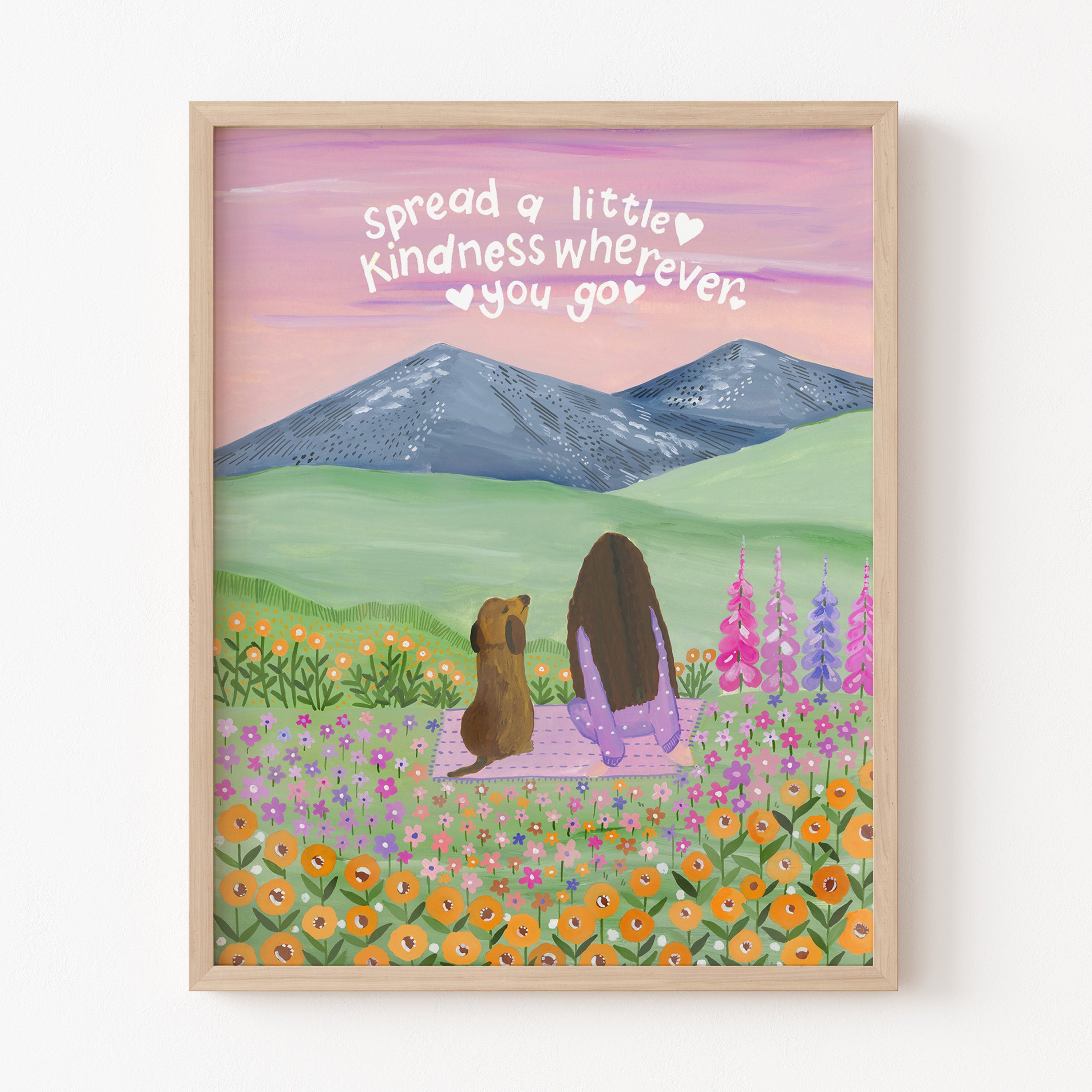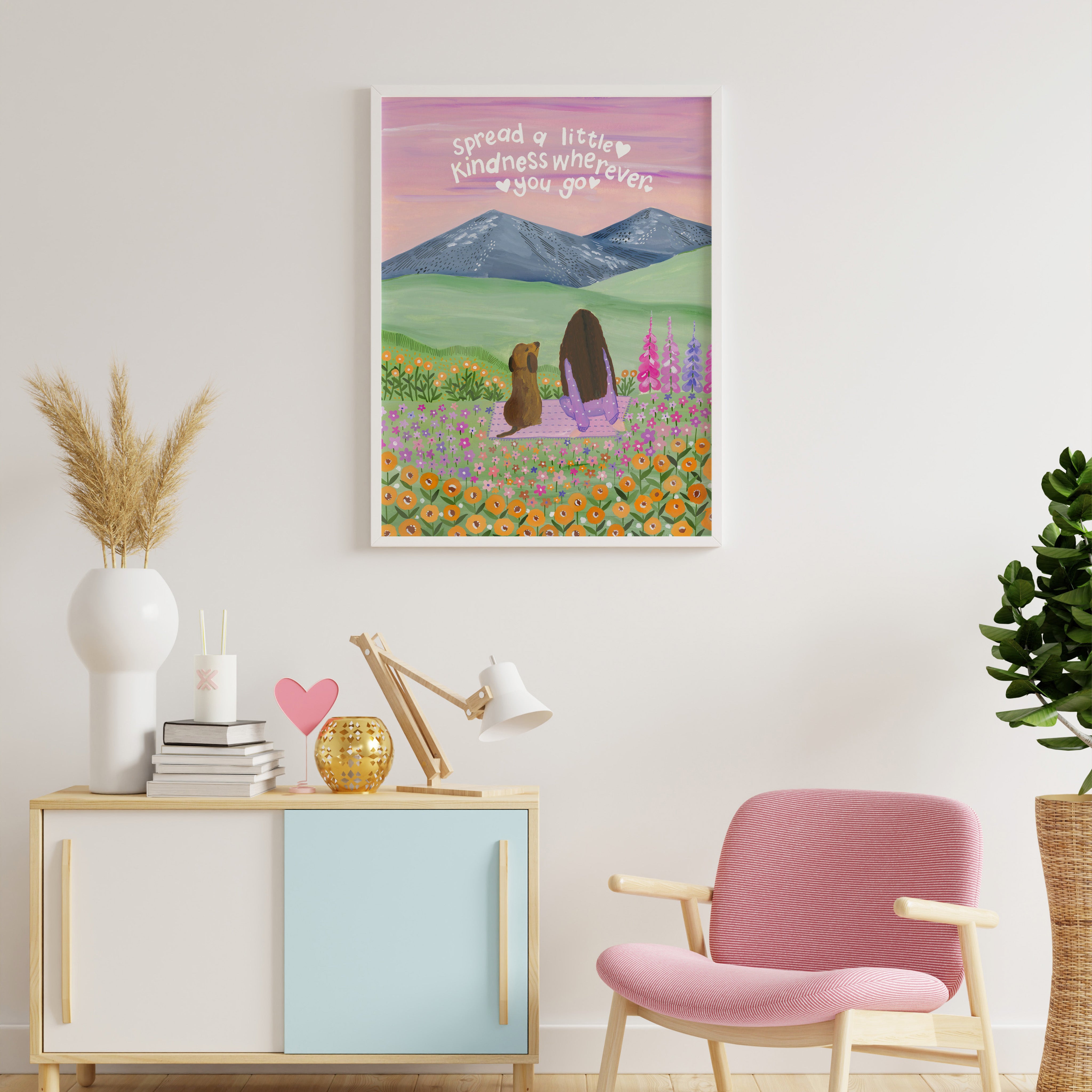 Set against soft mountains and a sky brushed in gentle hues, Where Kindness Grows captures a quiet moment of connection and warmth. Surrounded by wildflowers and open fields, the scene reminds us that even the smallest acts of kindness can ripple far beyond what we see.
