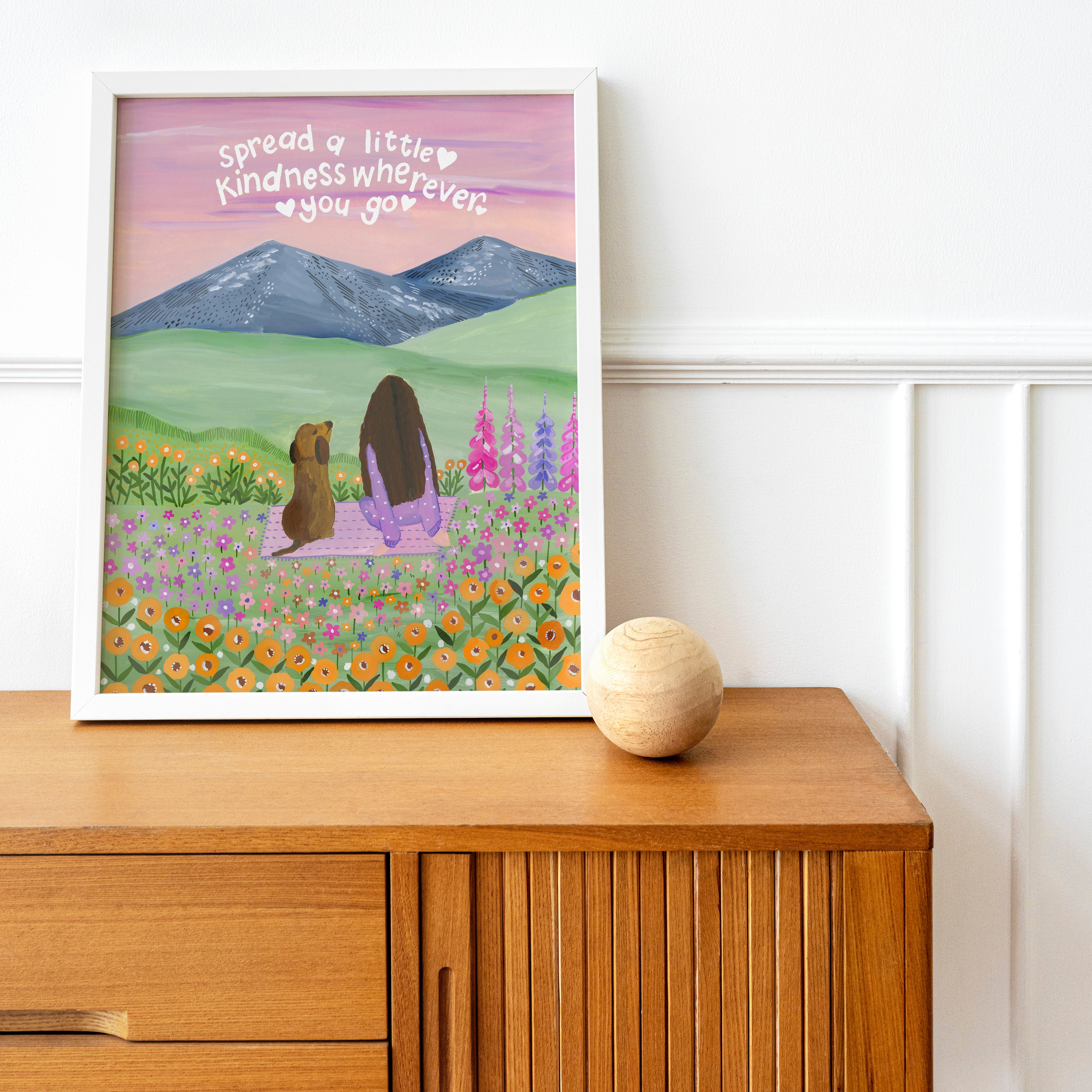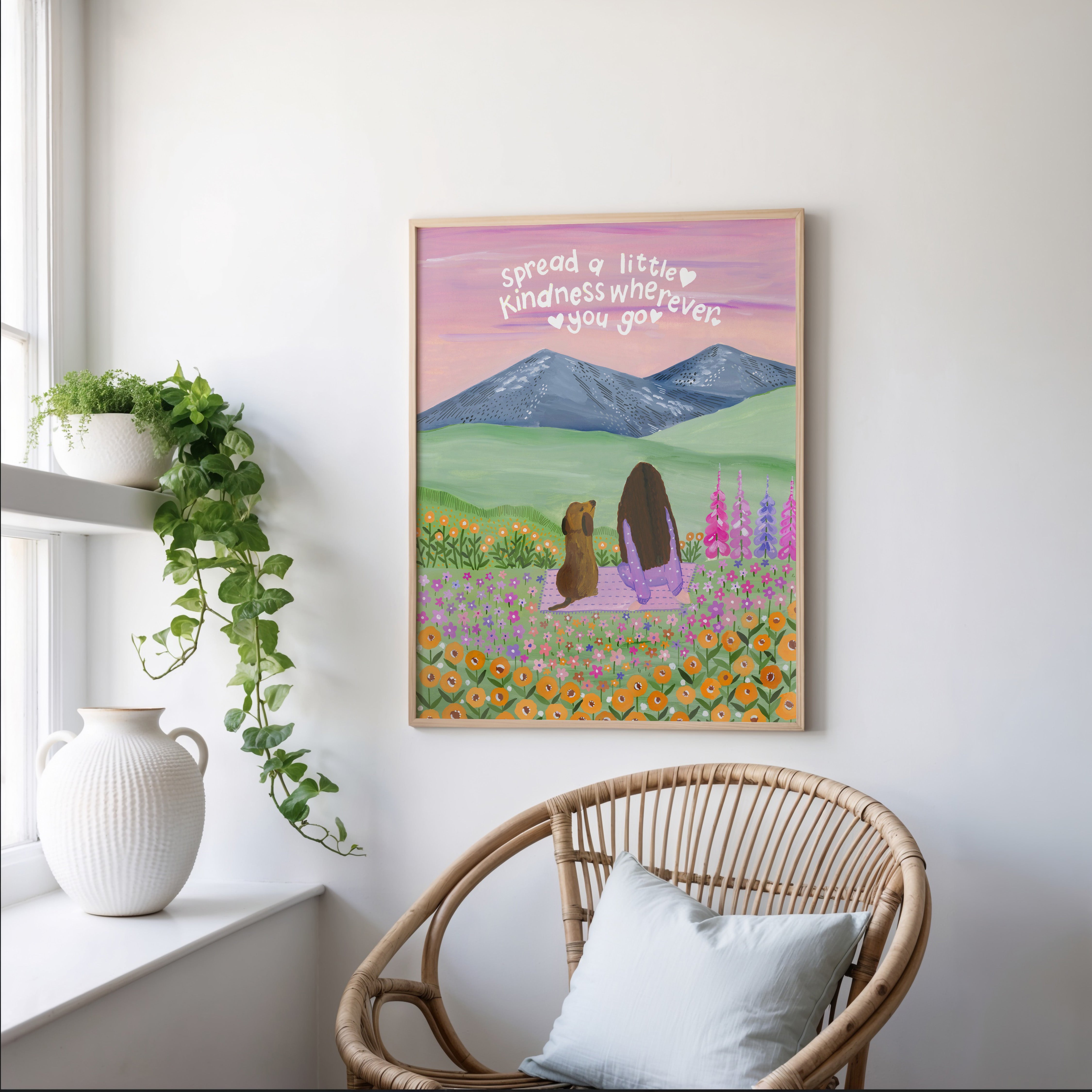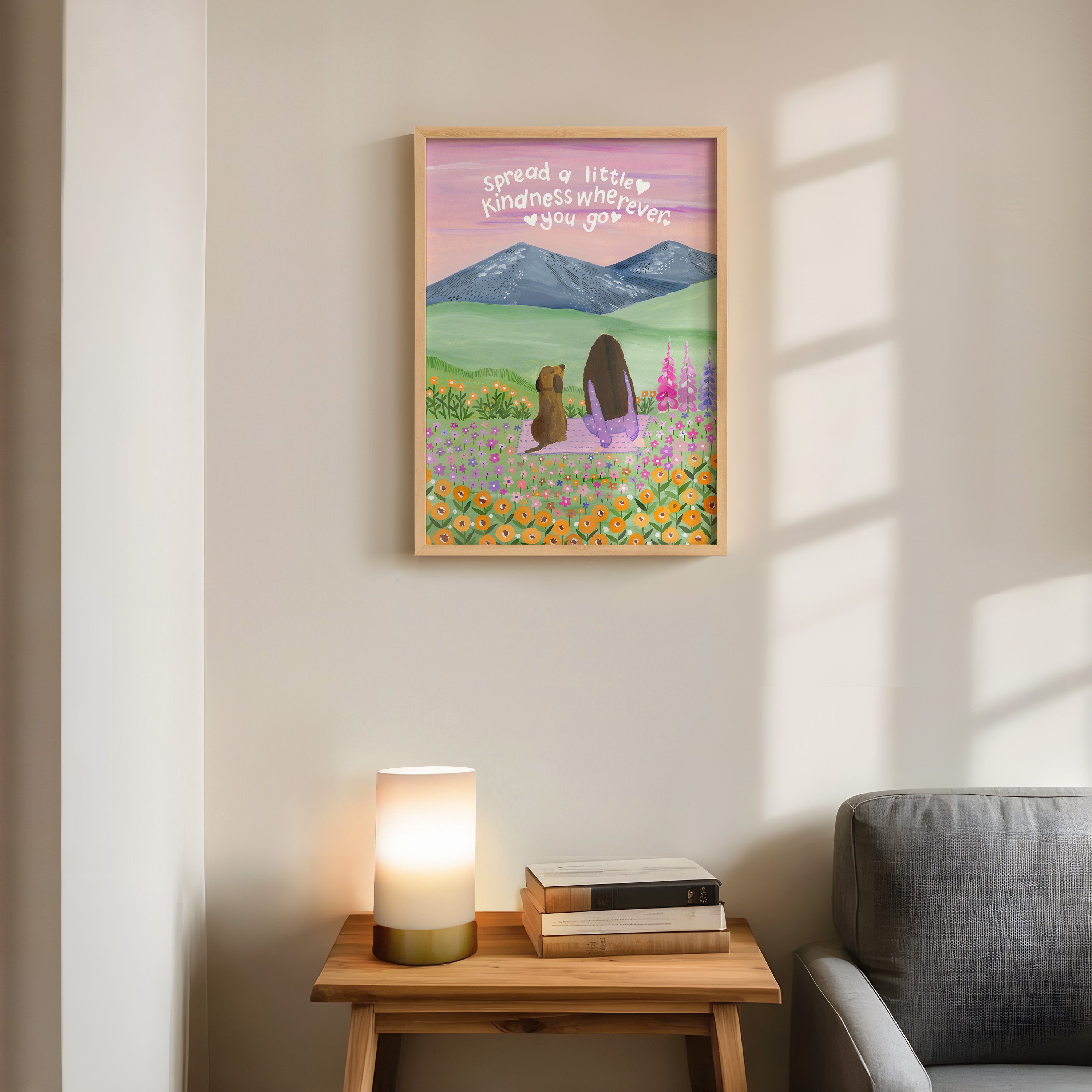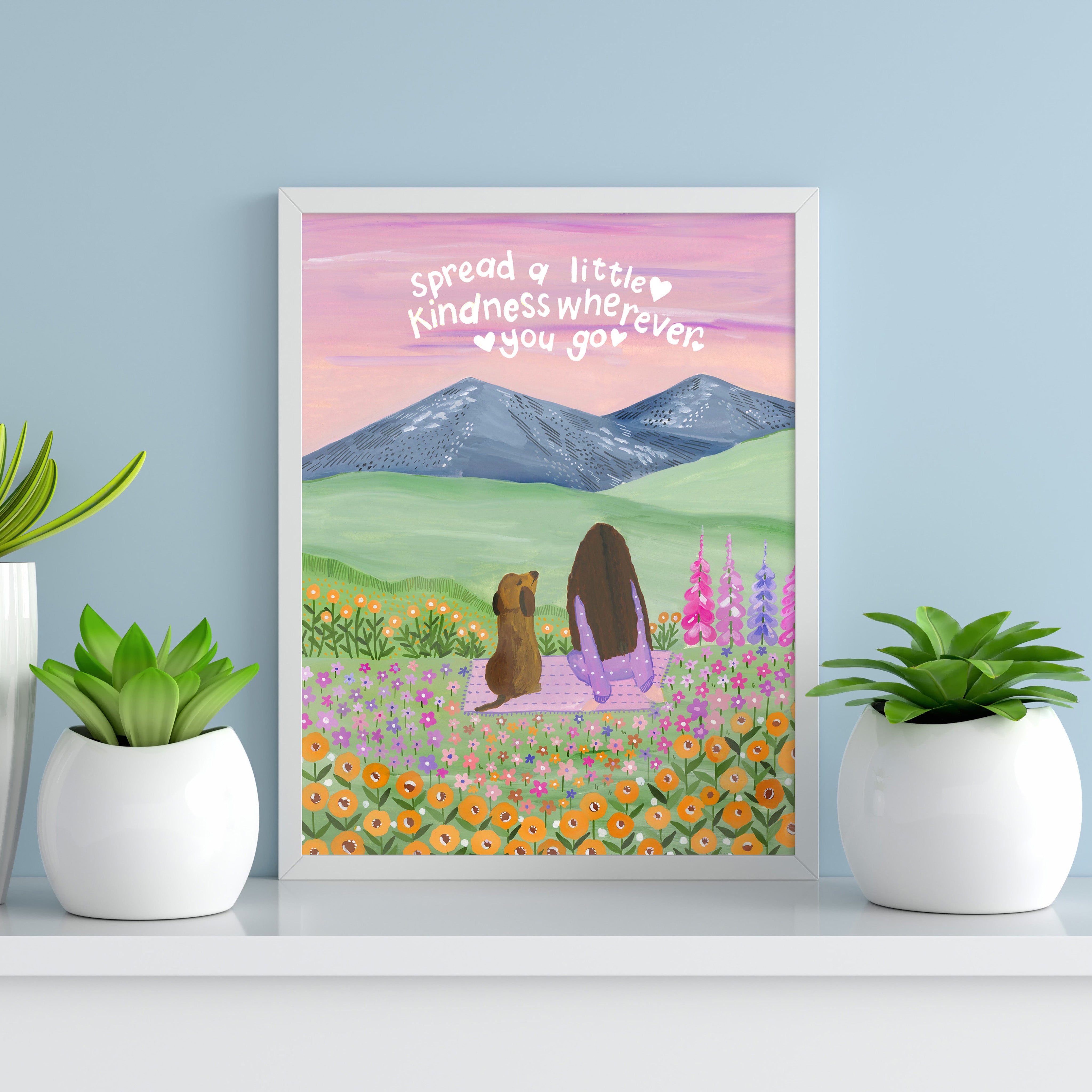 Set against soft mountains and a sky brushed in gentle hues, Where Kindness Grows captures a quiet moment of connection and warmth. Surrounded by wildflowers and open fields, the scene reminds us that even the smallest acts of kindness can ripple far beyond what we see.