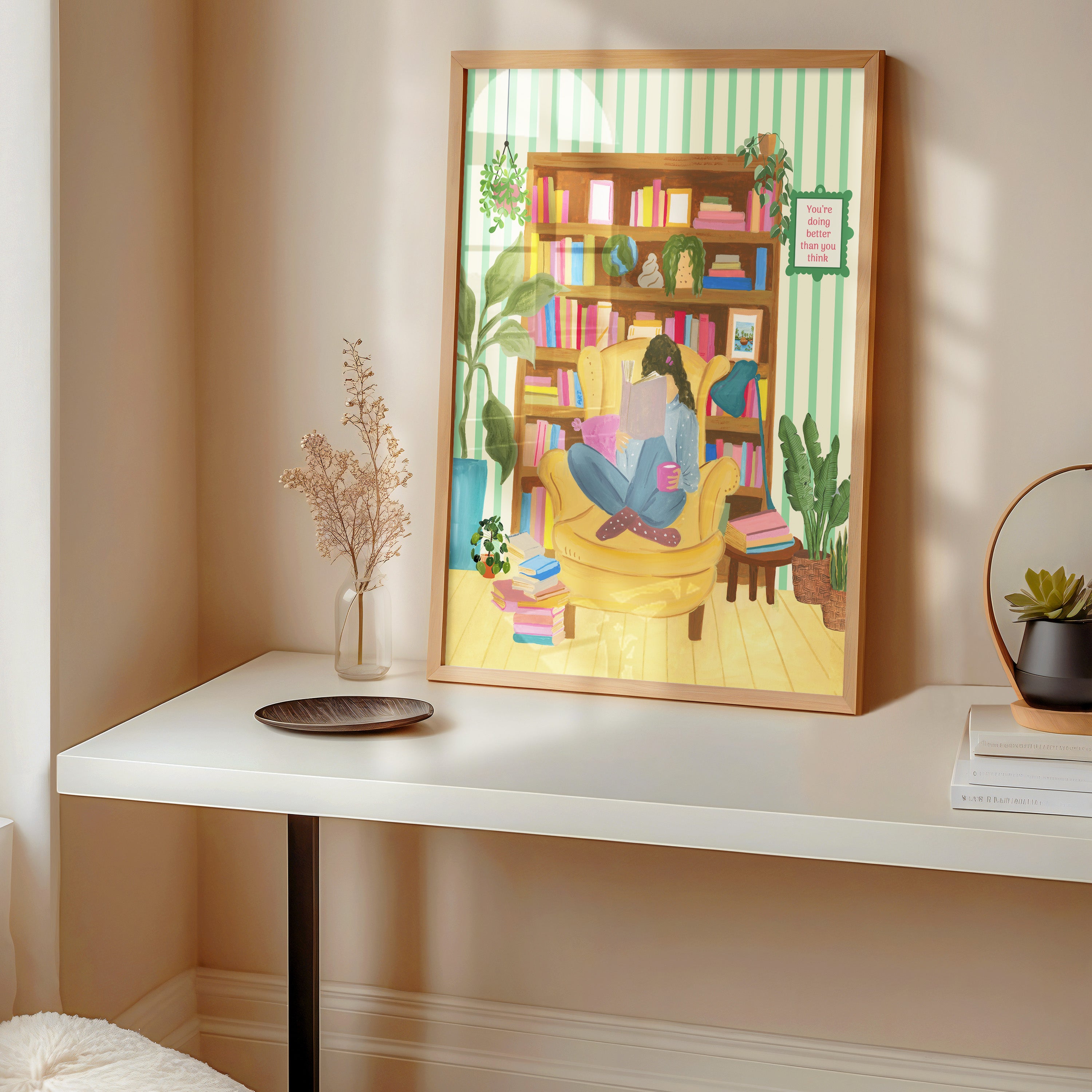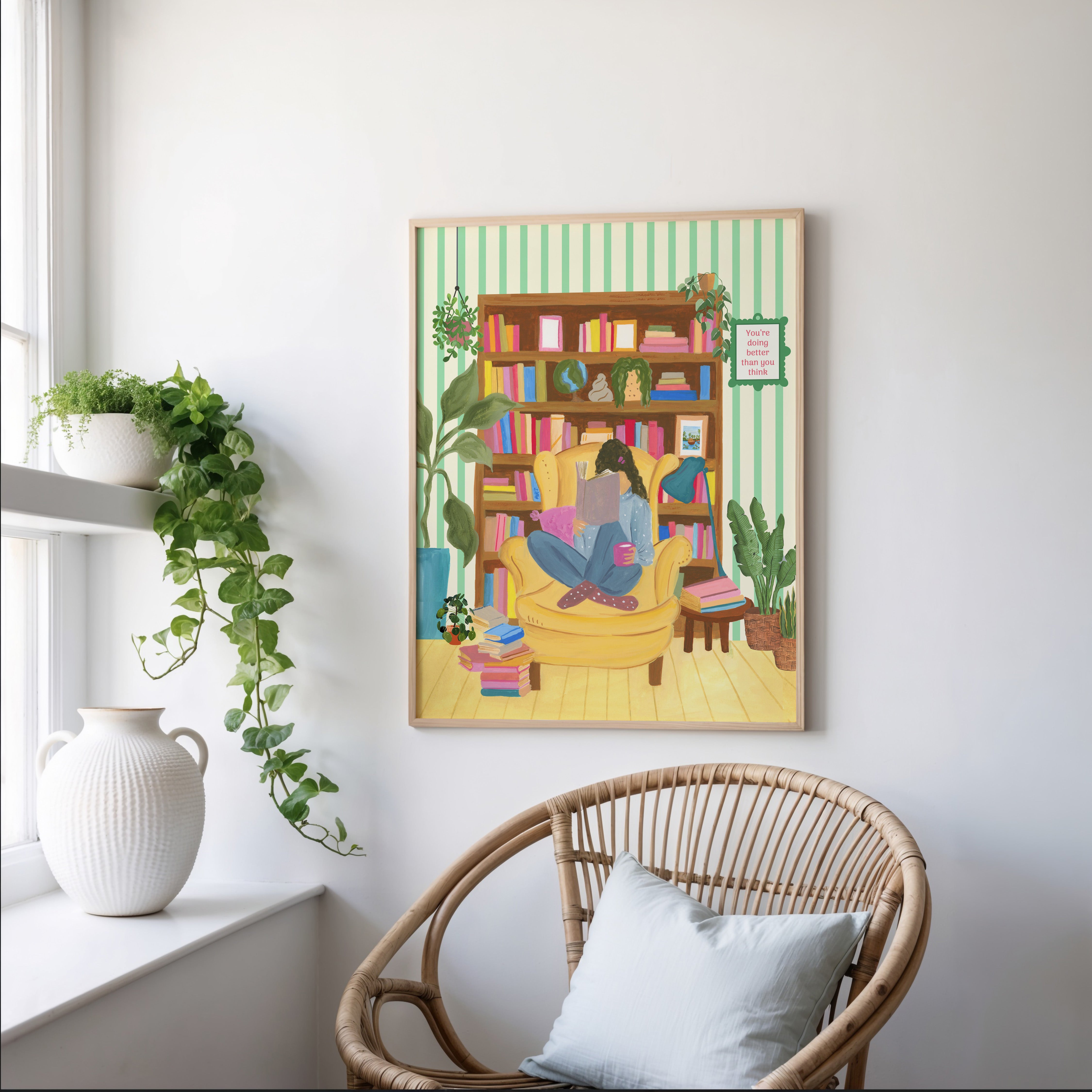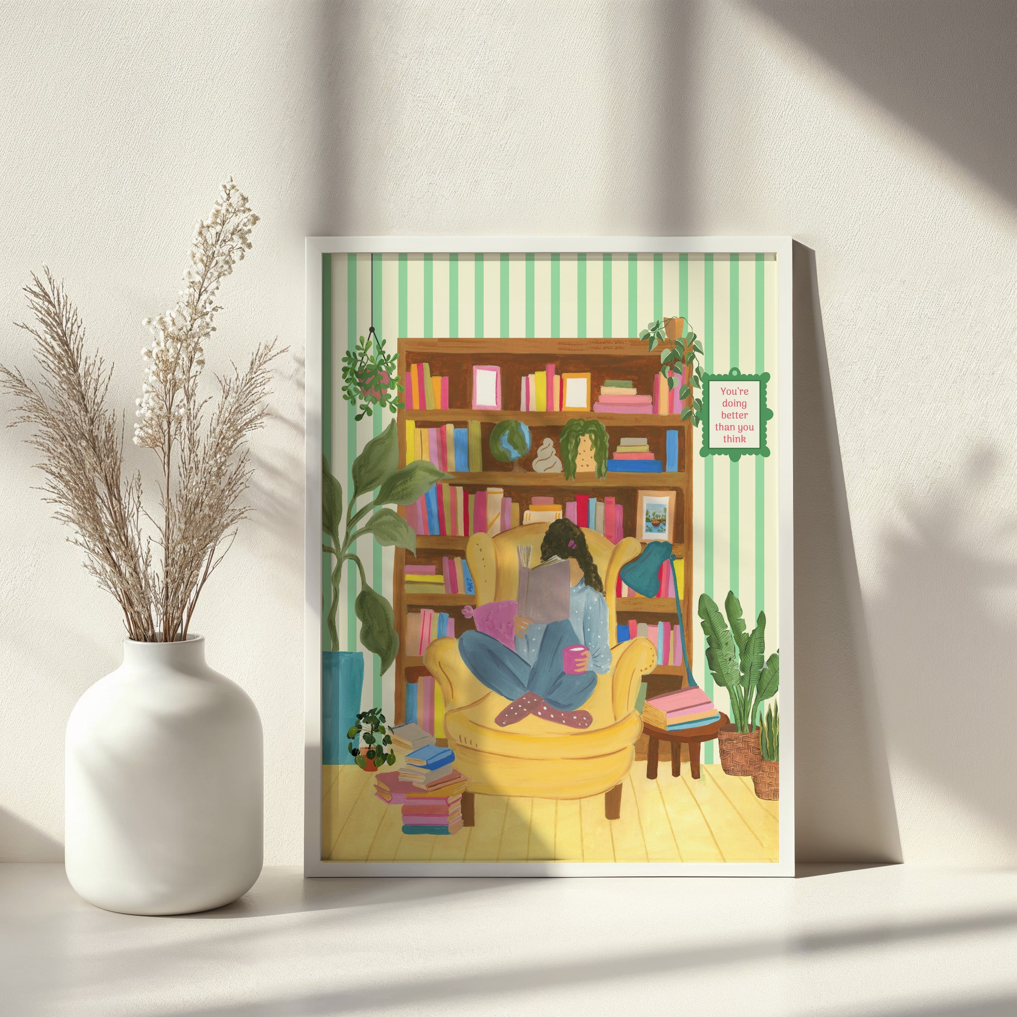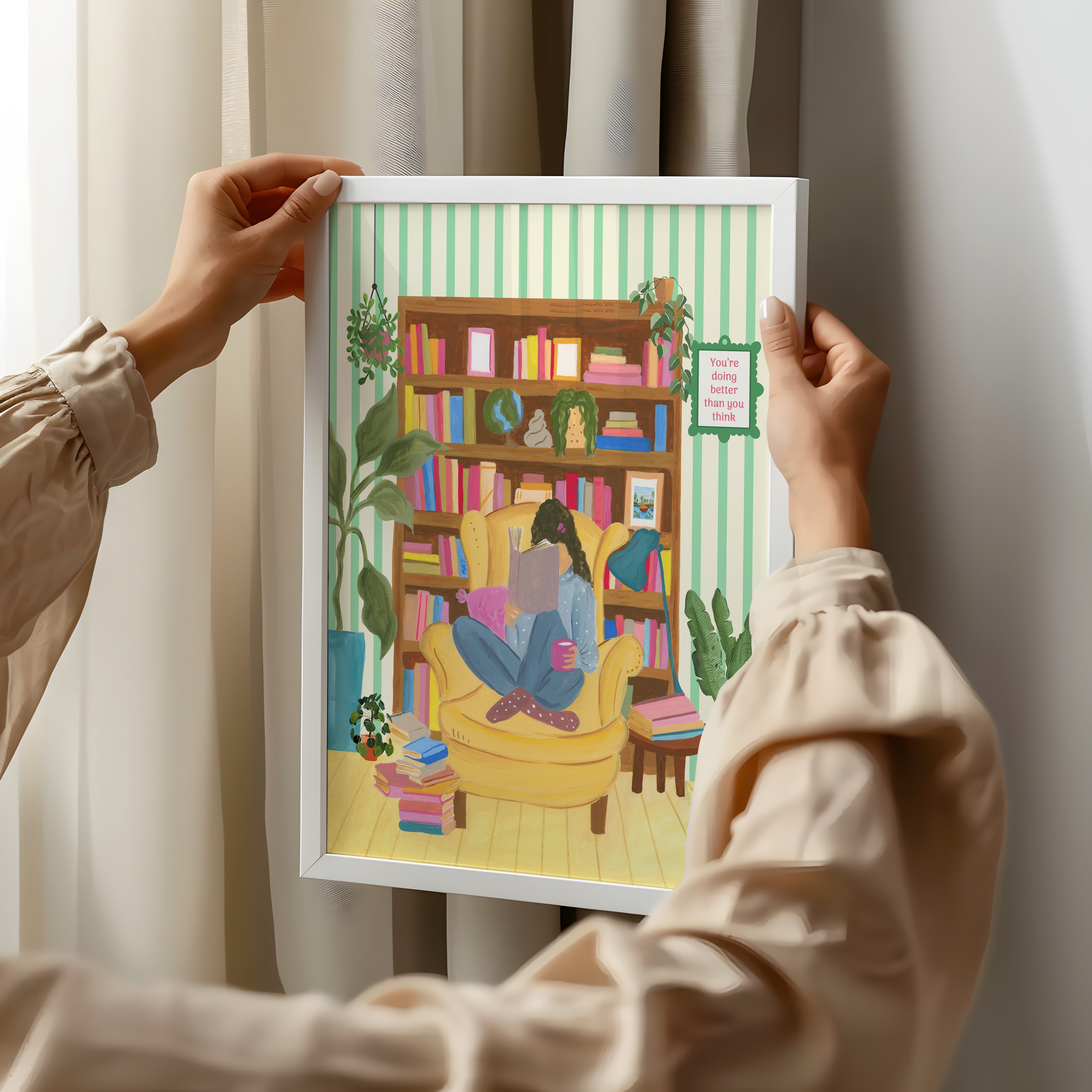 The artwork portrays a serene scene where a woman, seated comfortably amidst lush greenery and vibrant blossoms, takes a moment to unwind. The soothing palette of greens, pinks, and blues evokes a sense of calm, reinforcing the importance of self-care and inner peace. The words "You're doing better than you think" serve as a powerful affirmation, encouraging you to nurture your mind, body, and soul.