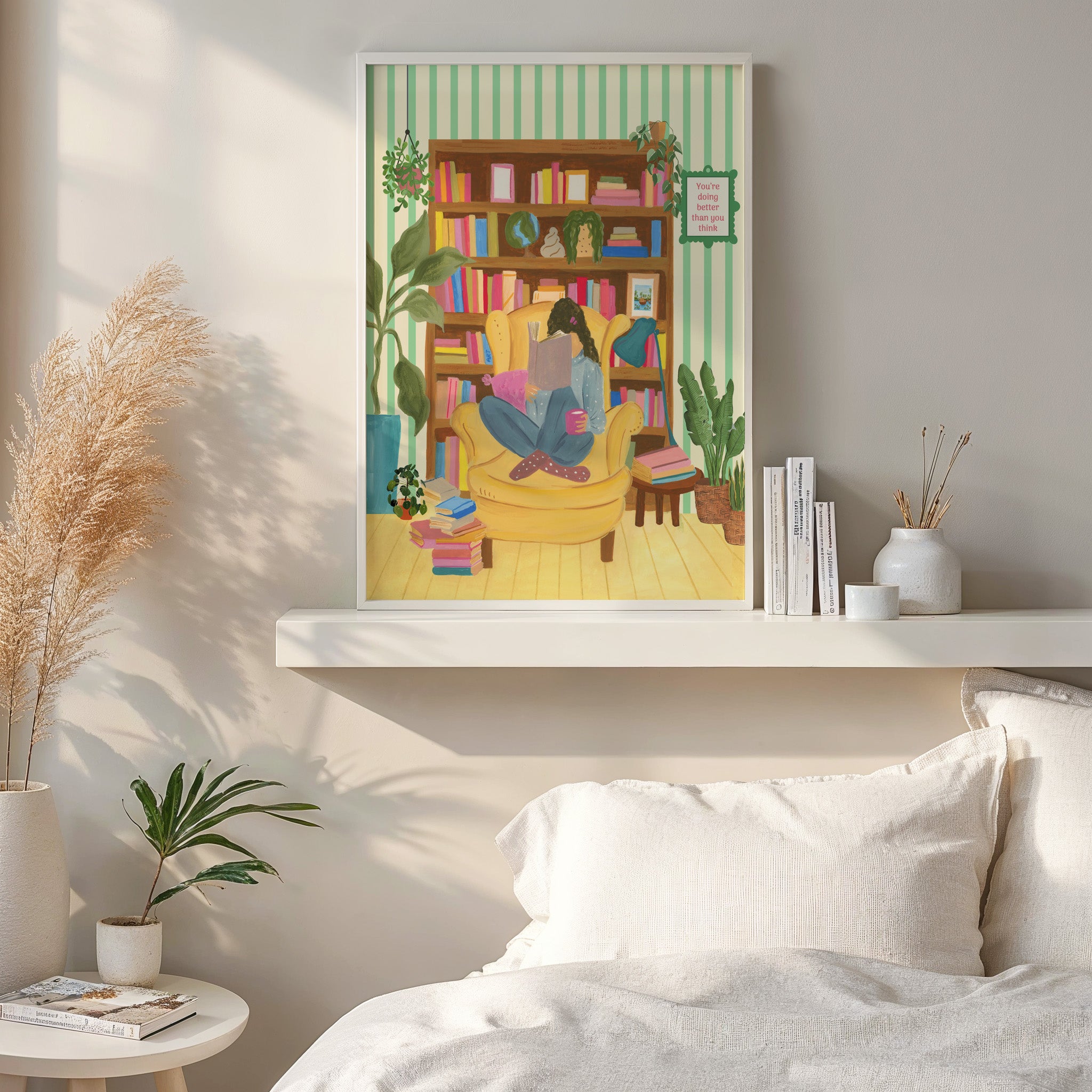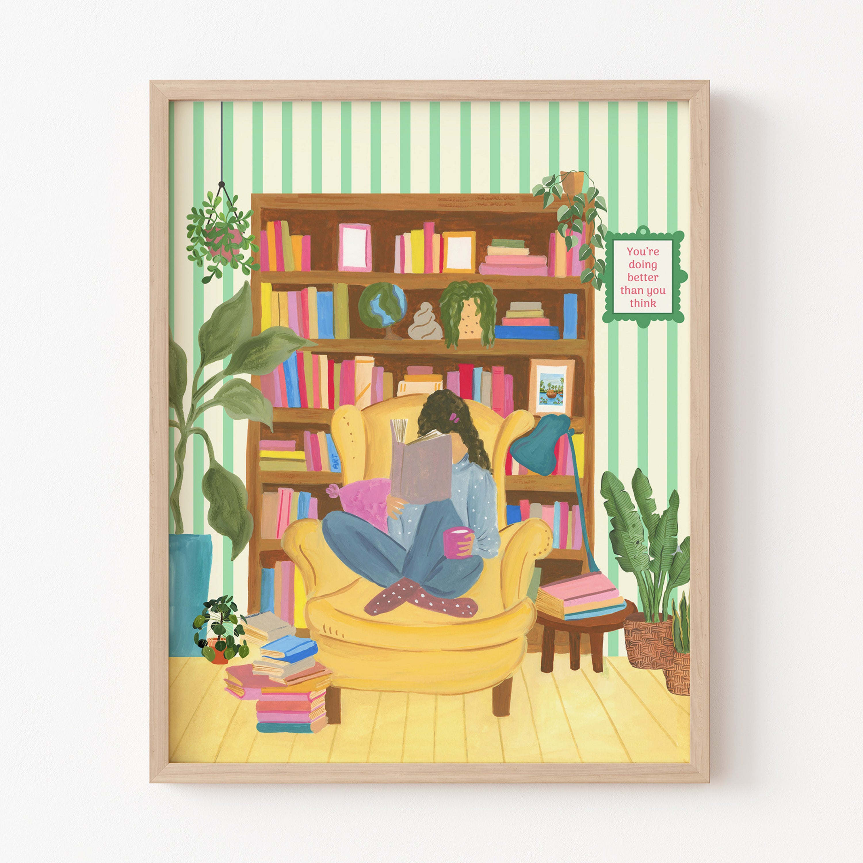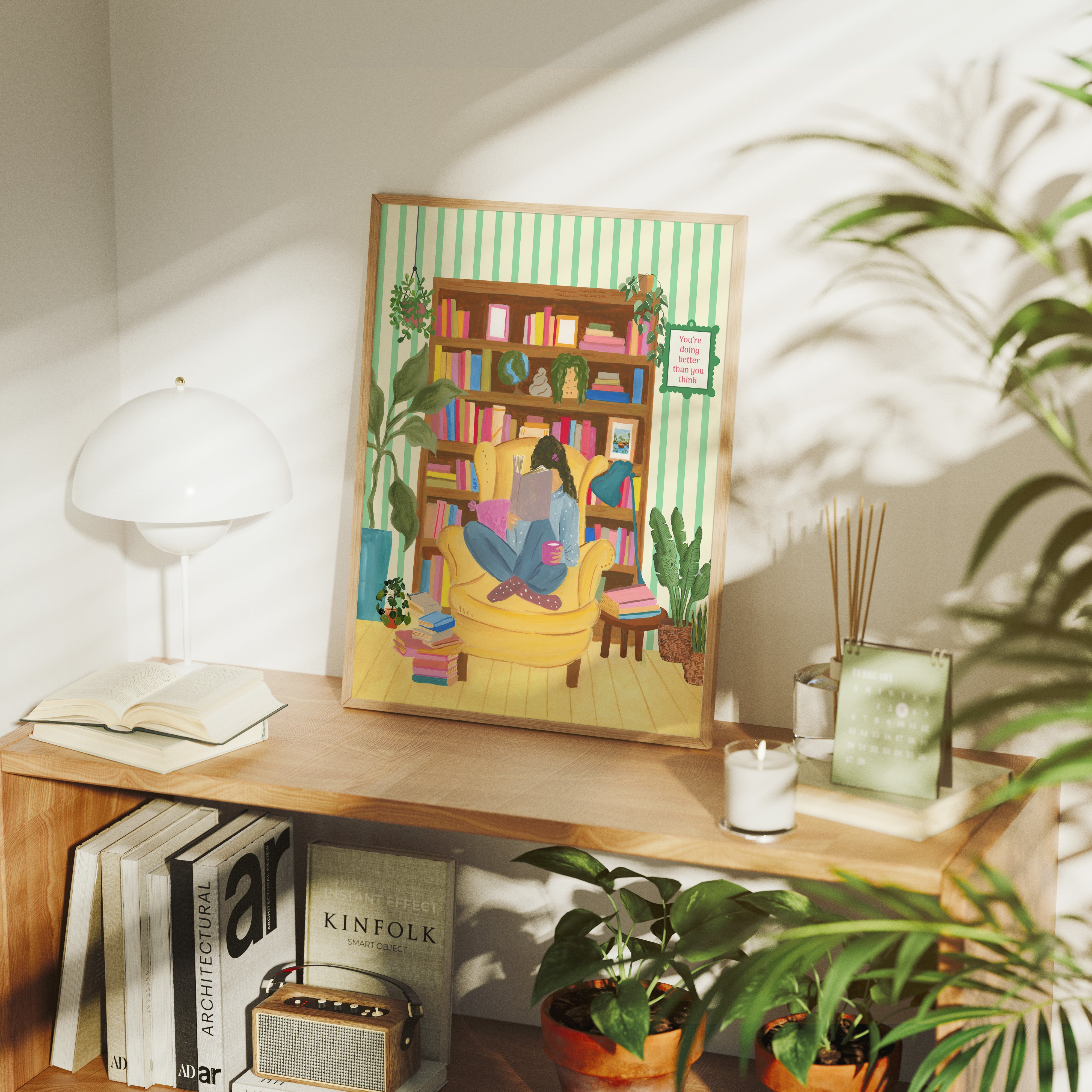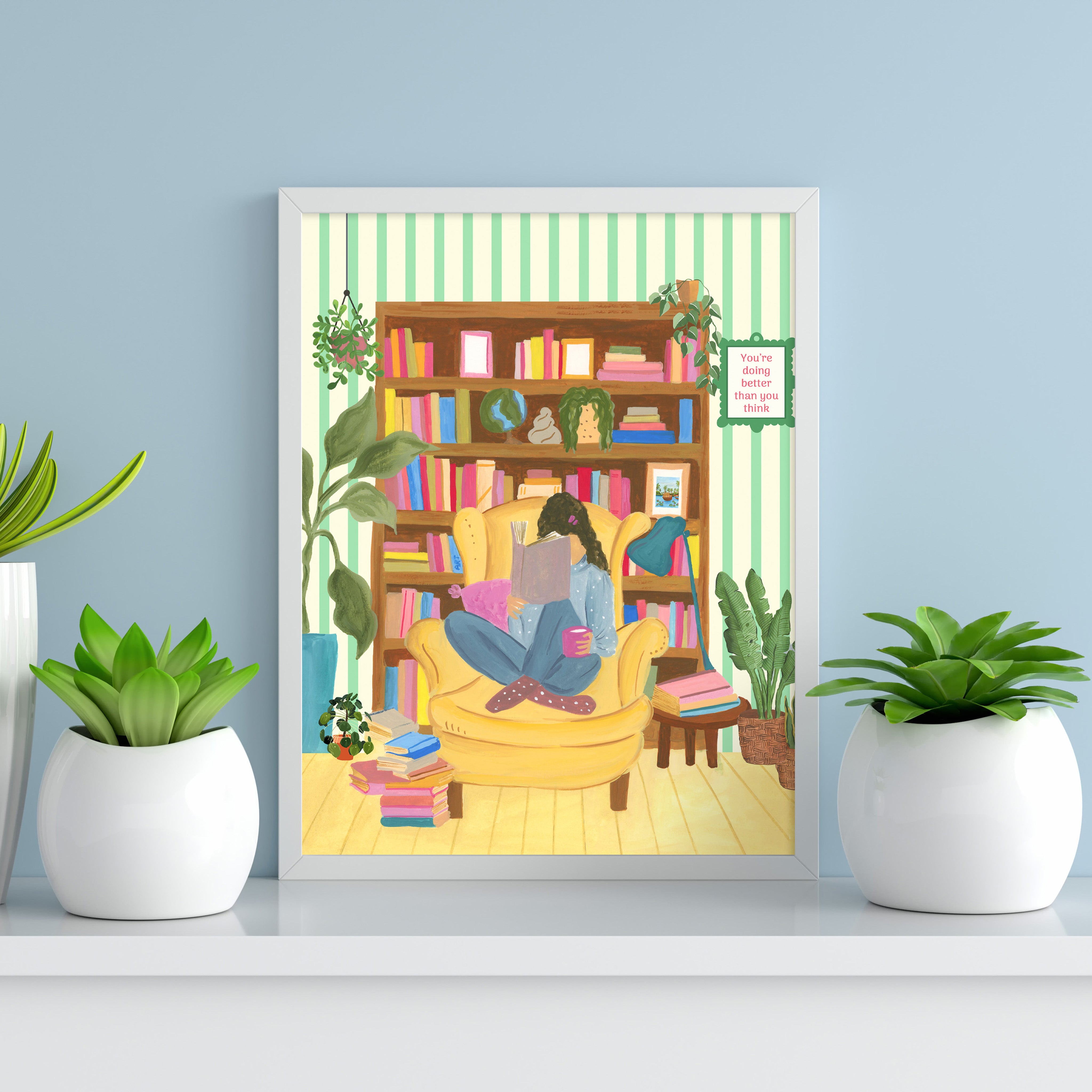 The artwork portrays a serene scene where a woman, seated comfortably amidst lush greenery and vibrant blossoms, takes a moment to unwind. The soothing palette of greens, pinks, and blues evokes a sense of calm, reinforcing the importance of self-care and inner peace. The words "You're doing better than you think" serve as a powerful affirmation, encouraging you to nurture your mind, body, and soul.