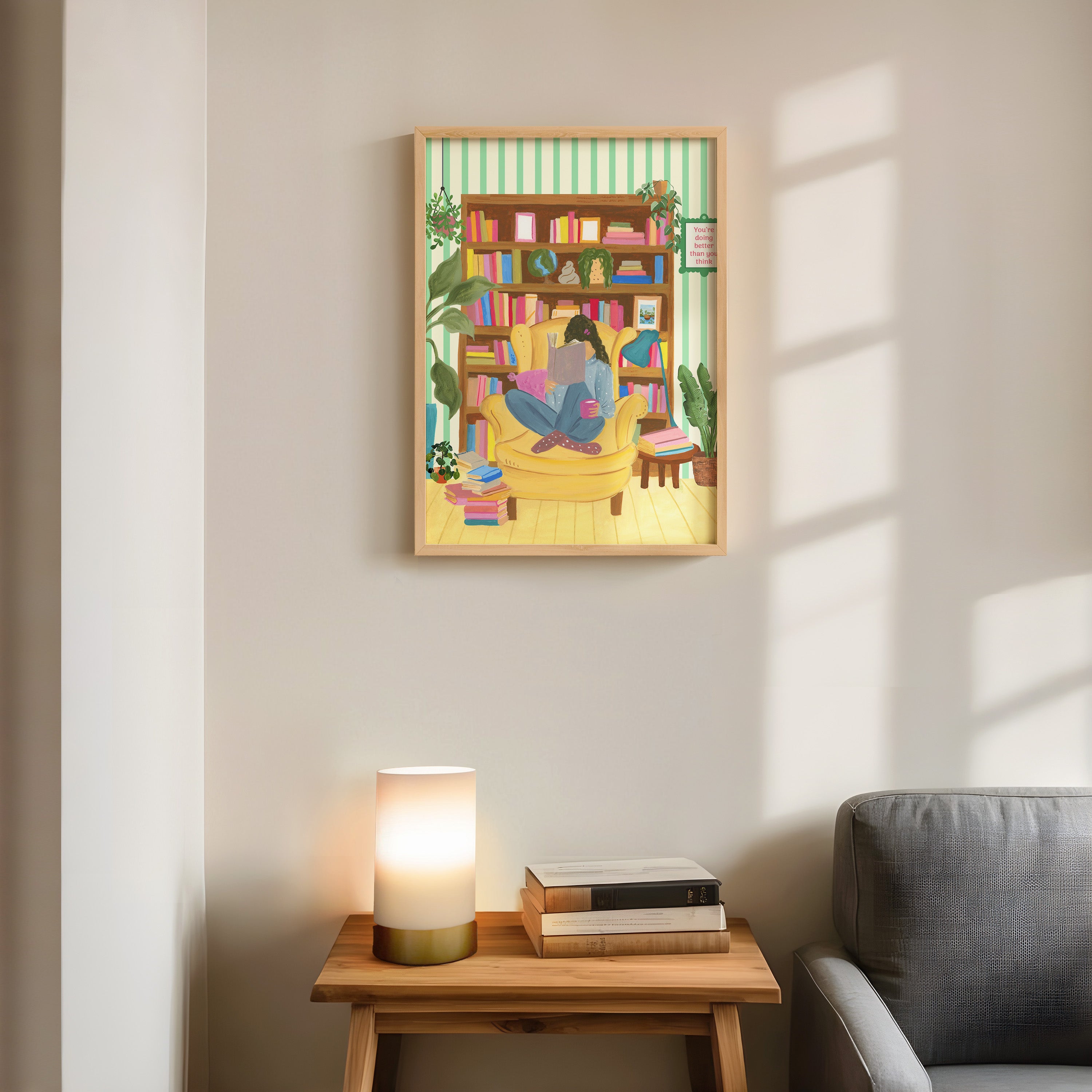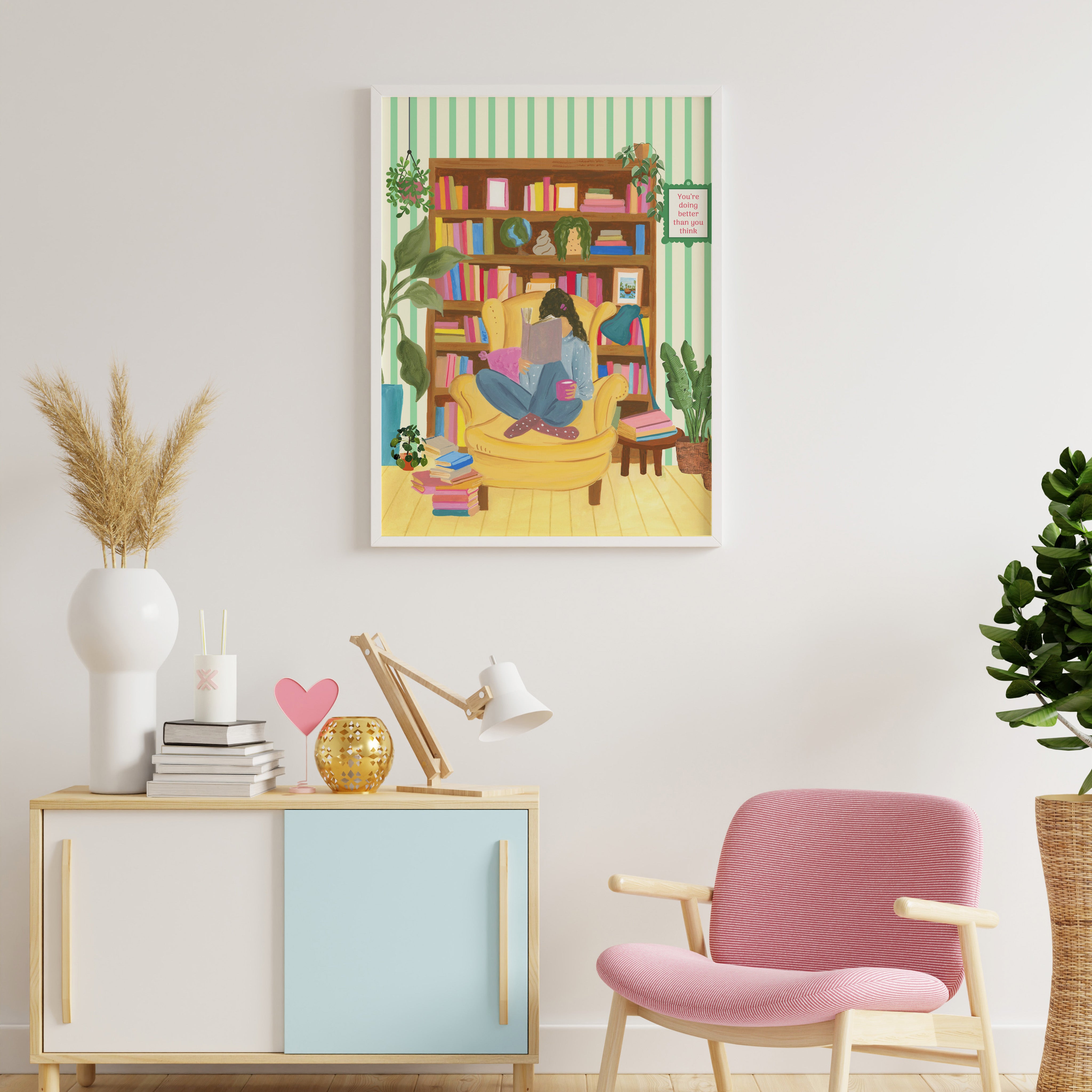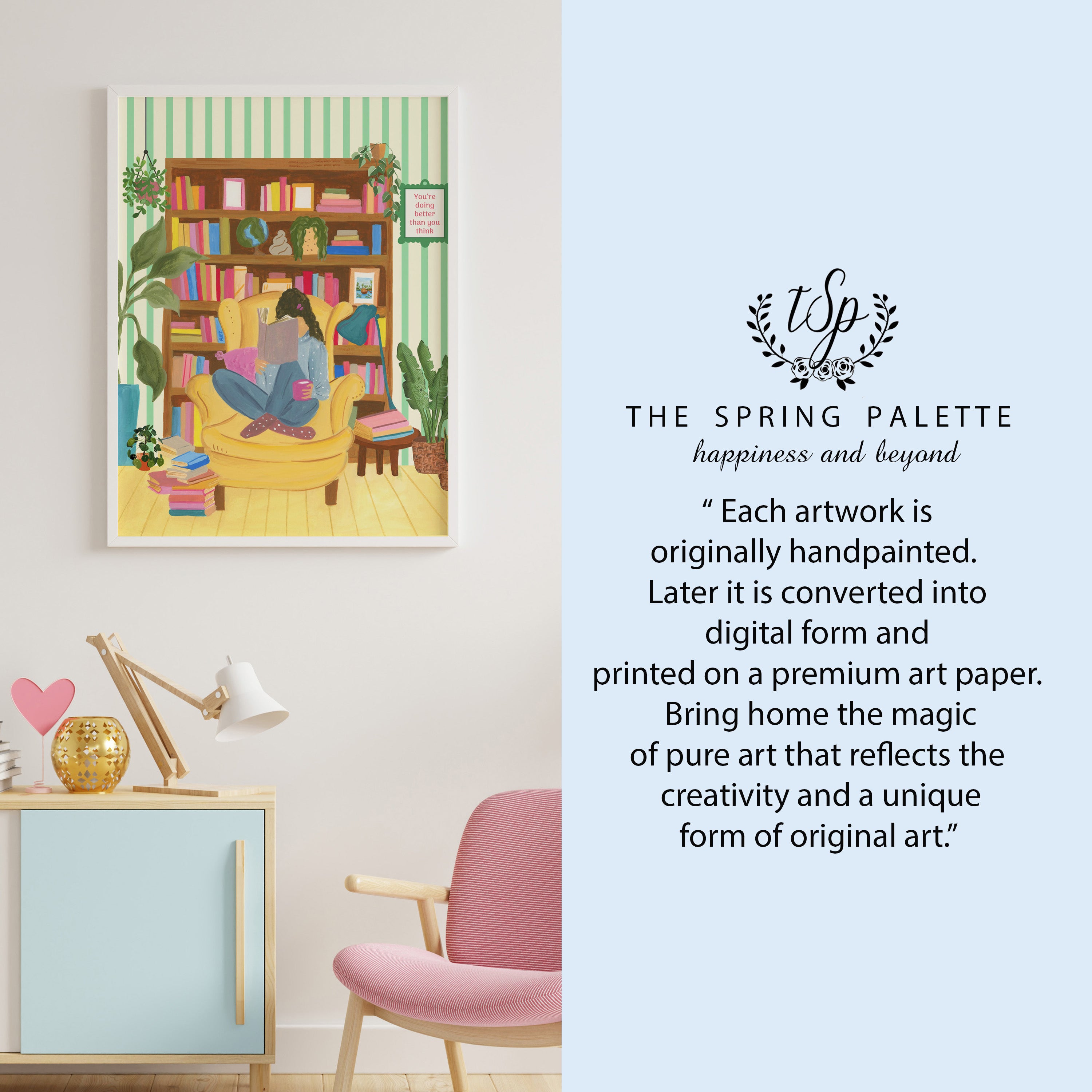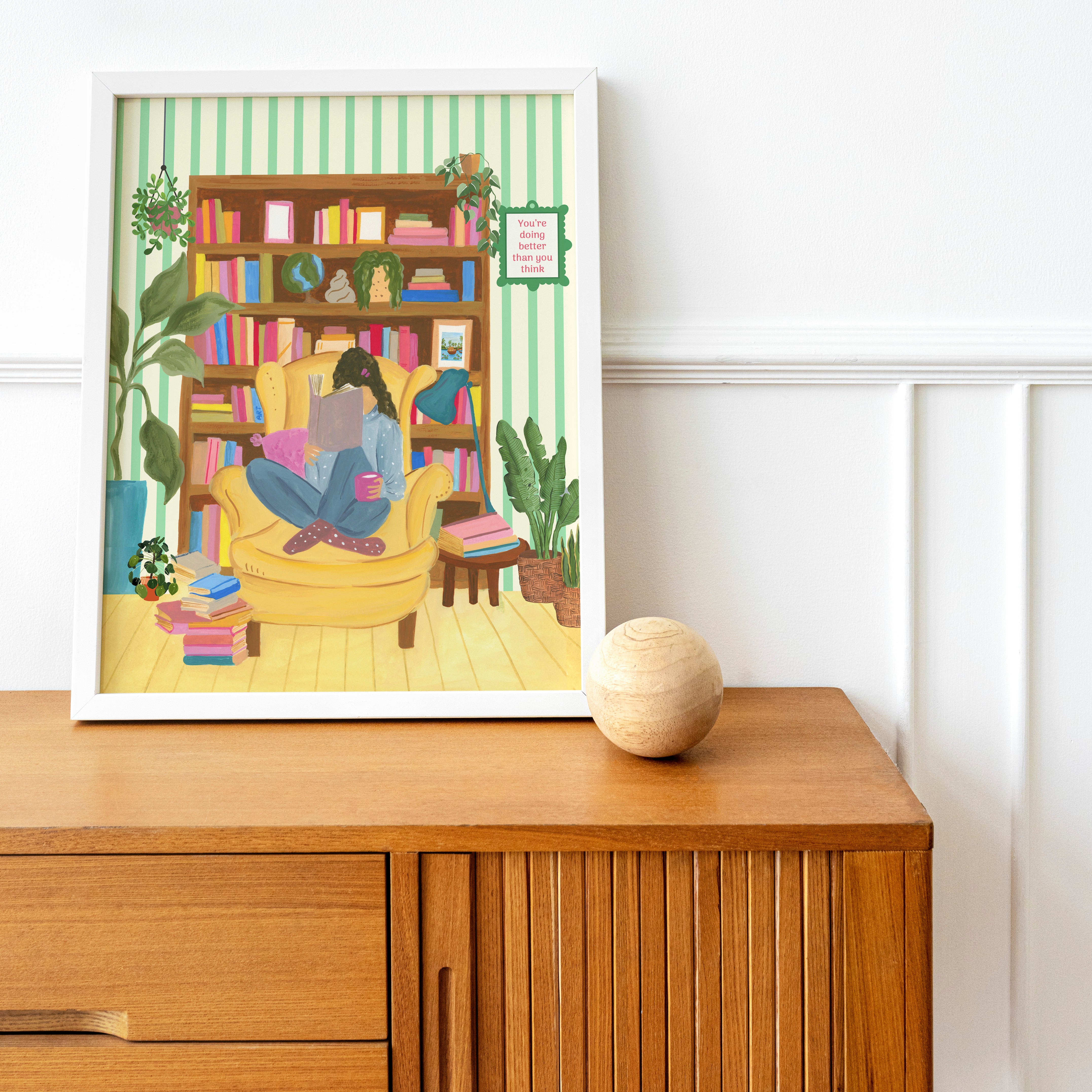 The artwork portrays a serene scene where a woman, seated comfortably amidst lush greenery and vibrant blossoms, takes a moment to unwind. The soothing palette of greens, pinks, and blues evokes a sense of calm, reinforcing the importance of self-care and inner peace. The words "You're doing better than you think" serve as a powerful affirmation, encouraging you to nurture your mind, body, and soul.